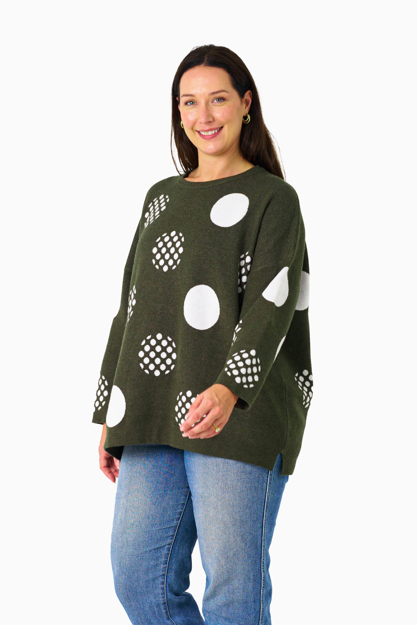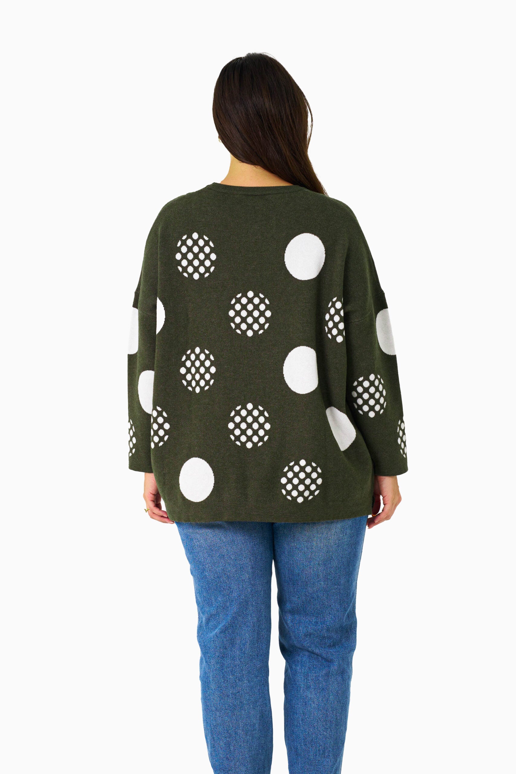 Playful yet refined, the Alannah Knit Top in Khaki with White Dot print brings a fresh twist to classic knitwear. Crafted from a soft, stretch knit, this top features a lightweight feel, delicate ribbing, and a fitted silhouette with a touch of retro charm. The subtle khaki base and contrasting white dot pattern make it easy to dress up or down — perfect for layering under jackets or pairing with denim and skirts.