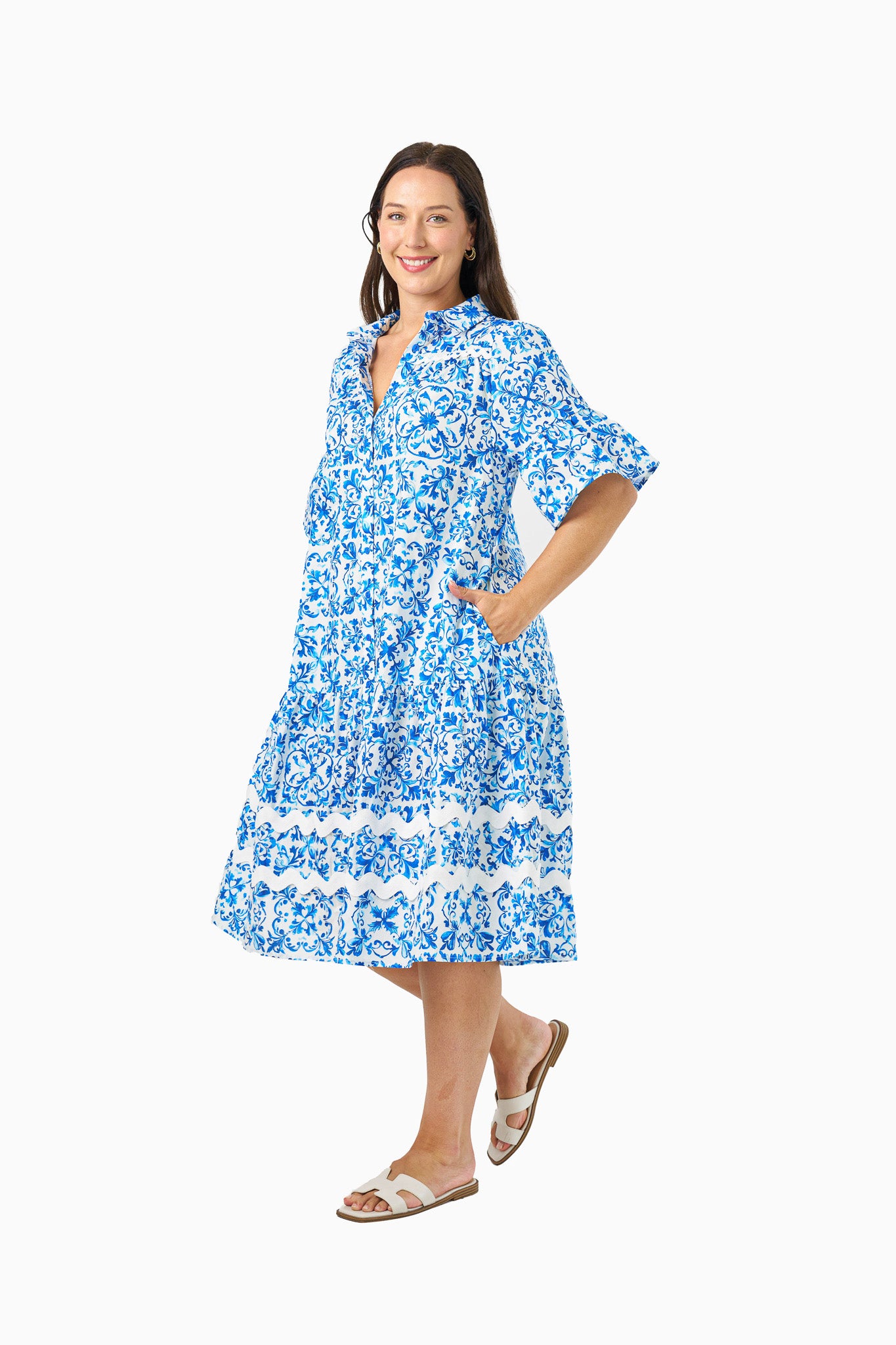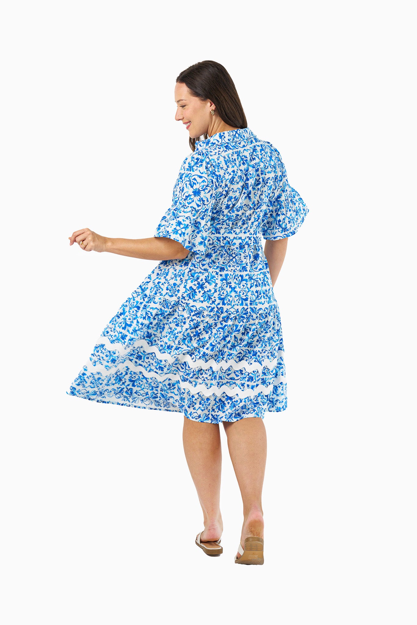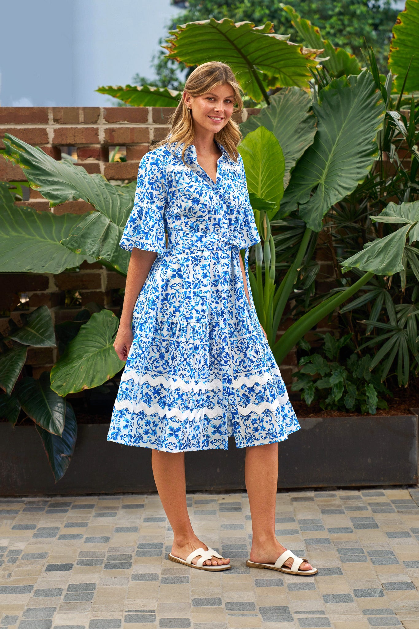 | Descriptions | – Collar v-neckline – Button front detail – Bell sleeves – One tier at hem – Side seam pockets – Self fabric belt – Rick rack trim detail design |