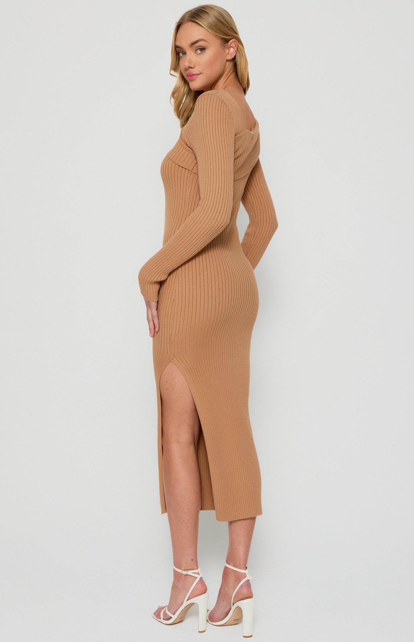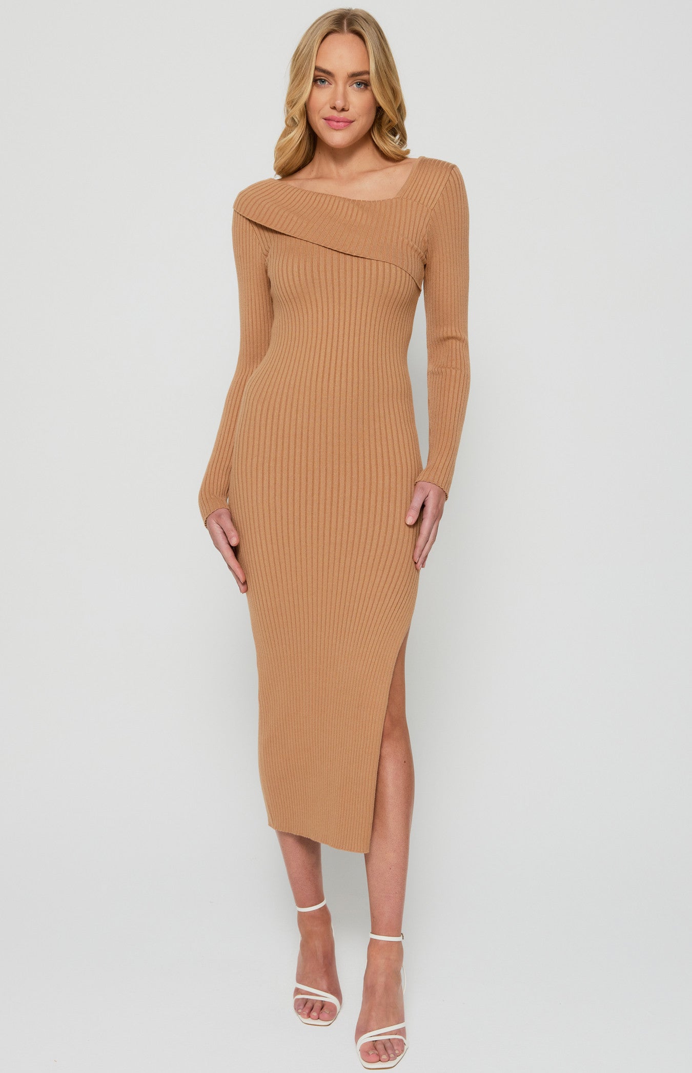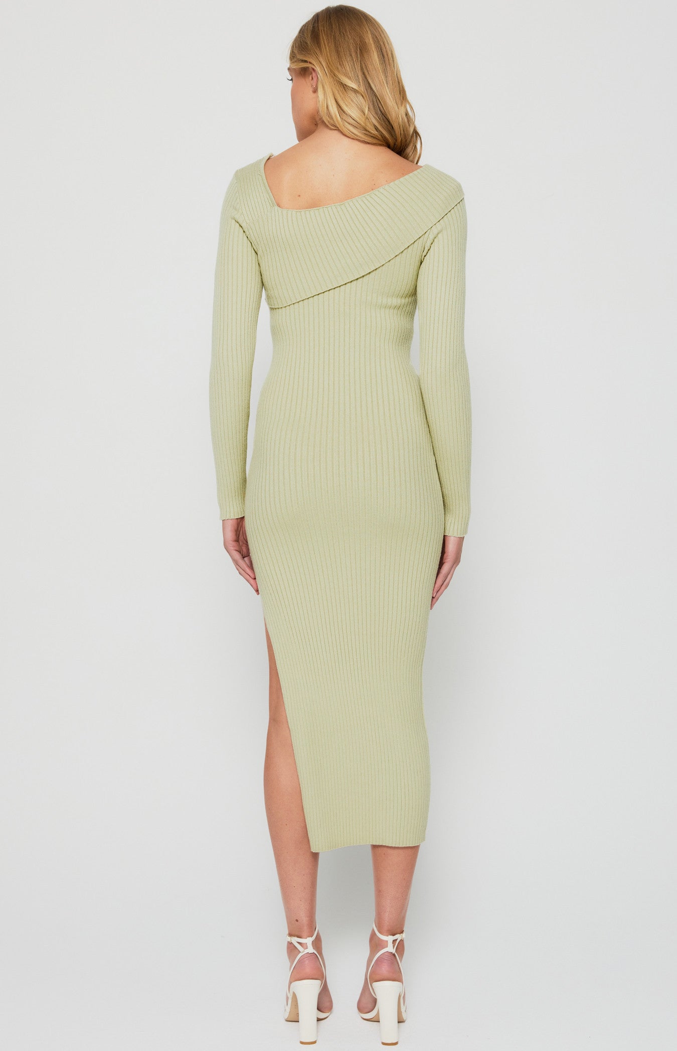 Chic and sculptural, the Asymmetrical Neckline Knit Dress with Side Split redefines effortless sophistication. Crafted from a soft stretch knit, this midi dress hugs in all the right places, while the one-shoulder neckline and thigh-high side split add contemporary allure. The muted avocado hue offers a refined alternative to classic neutrals, perfect for elevated daywear or understated evening elegance.