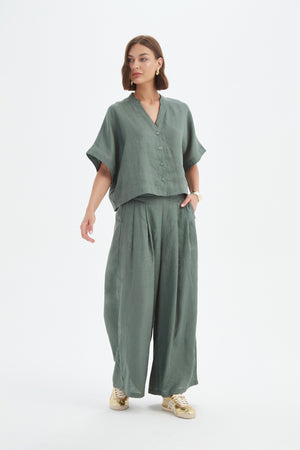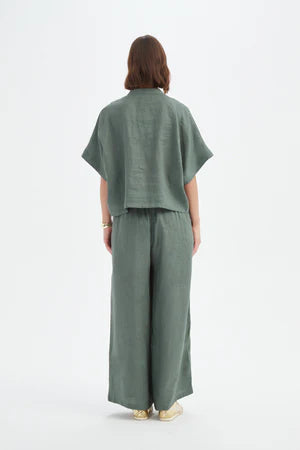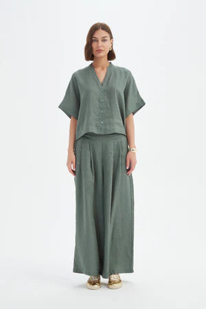 A modern take on the classic linen shirt, the Boxy Button Linen Shirt features a relaxed silhouette, notch neckline, and short wide sleeves. Its slightly cropped length makes it ideal for pairing with high-waisted pants or skirts, while wearing it buttoned up or layered open offers effortless versatility for day-to-day styling.