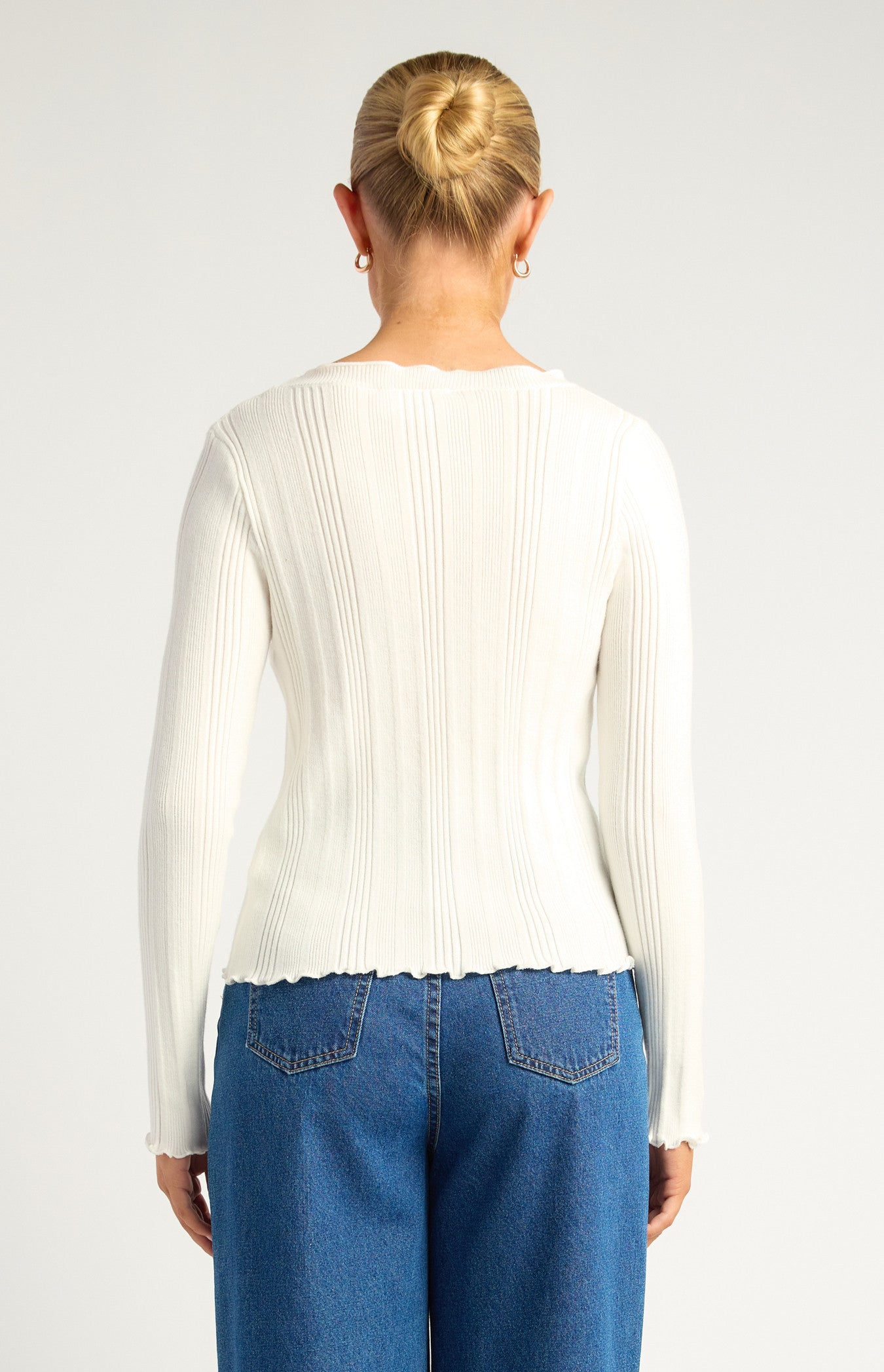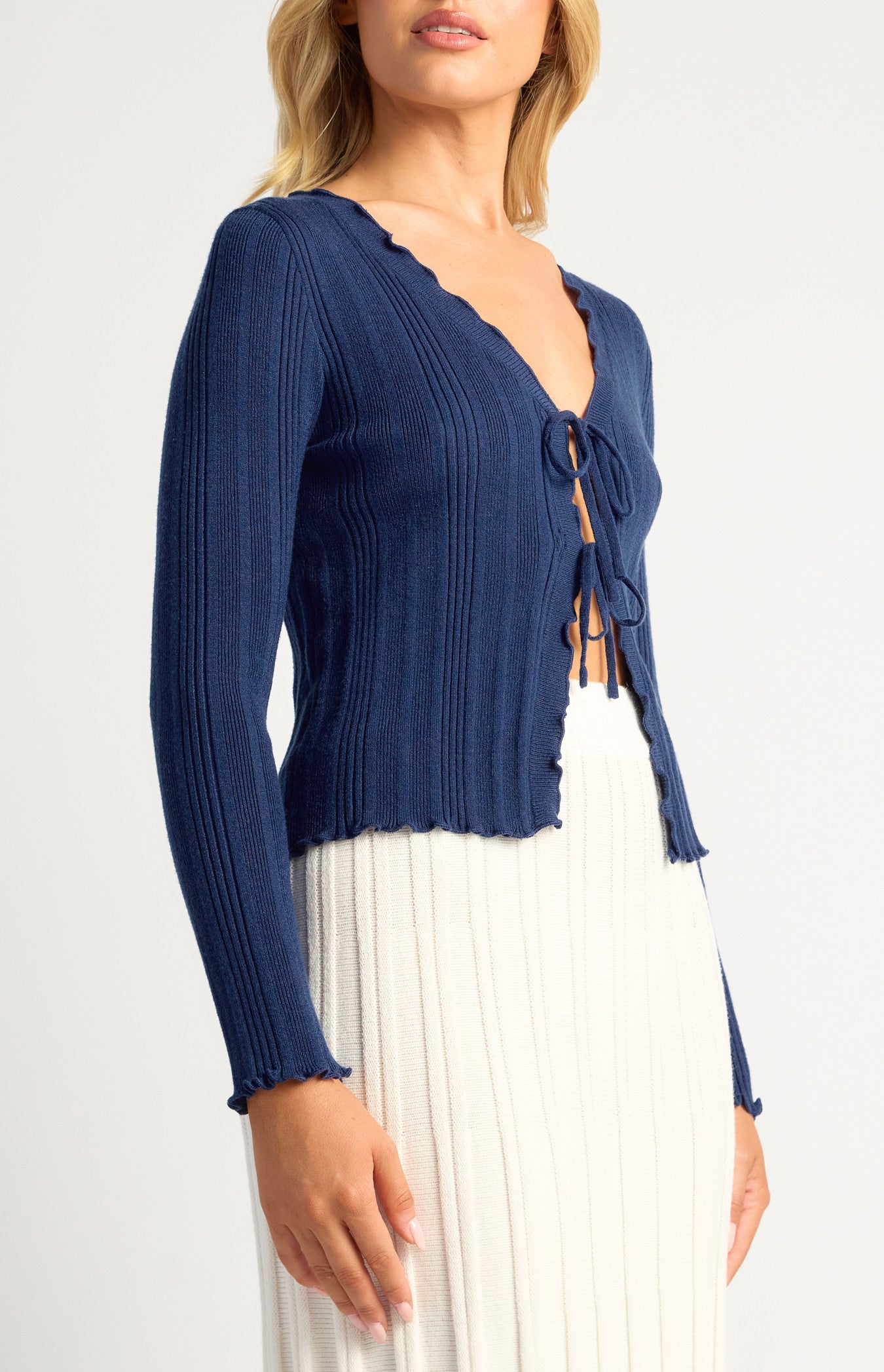 Feminine and playfully polished, the Double Front Tie Lettuce Edge Detail Knit Top is the perfect layering piece with a twist. Designed in a soft stretch knit, it features delicate lettuce-edge hems and twin front ties for adjustable styling. Whether worn open over a bralette or tied for a cropped finish, this piece brings texture and charm to any look.