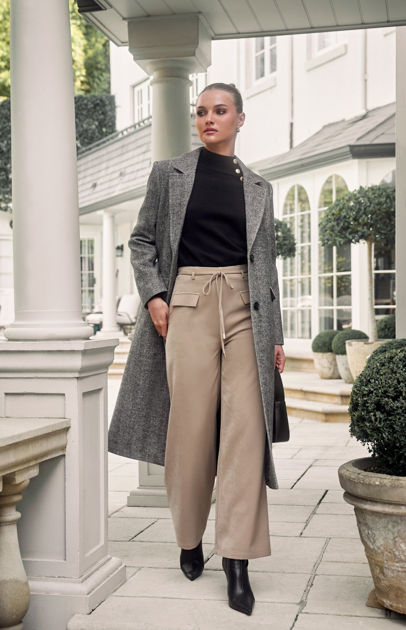Classic tailoring meets cold-weather luxury in the Faux Wool Herringbone Single Breasted Coat with Belt Accessory. Crafted from a soft-touch herringbone weave, this coat features a clean single-breasted front, notched lapels, and a matching belt to cinch the waist for a softly structured silhouette. Timeless and refined, itβs a staple outerwear piece for layering over everything from denim to dresses.