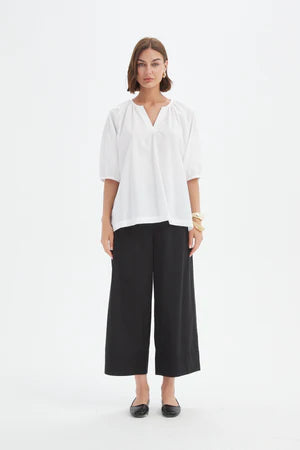 The Gathered Notch Neck Top is a refined staple with subtle detailing. Crafted from a breathable cotton/lyocell poplin blend, it features a notch neck and gathered details across the neckline and puff sleeves, creating volume and ease. Designed in a relaxed fit, this versatile top brings a playful edge to Spring dressing.