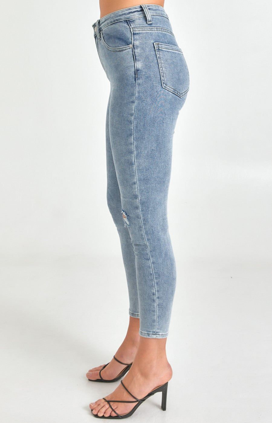 A timeless denim staple with just the right amount of edge, the High Waisted Skinny Jeans with Knee Rip offer a sleek silhouette and lived-in attitude. Crafted from soft stretch denim, these jeans feature a figure-hugging fit and distressed detailing at the knee for a perfectly balanced off-duty look. The deep indigo blue wash keeps things polished, making them easy to dress up or down.