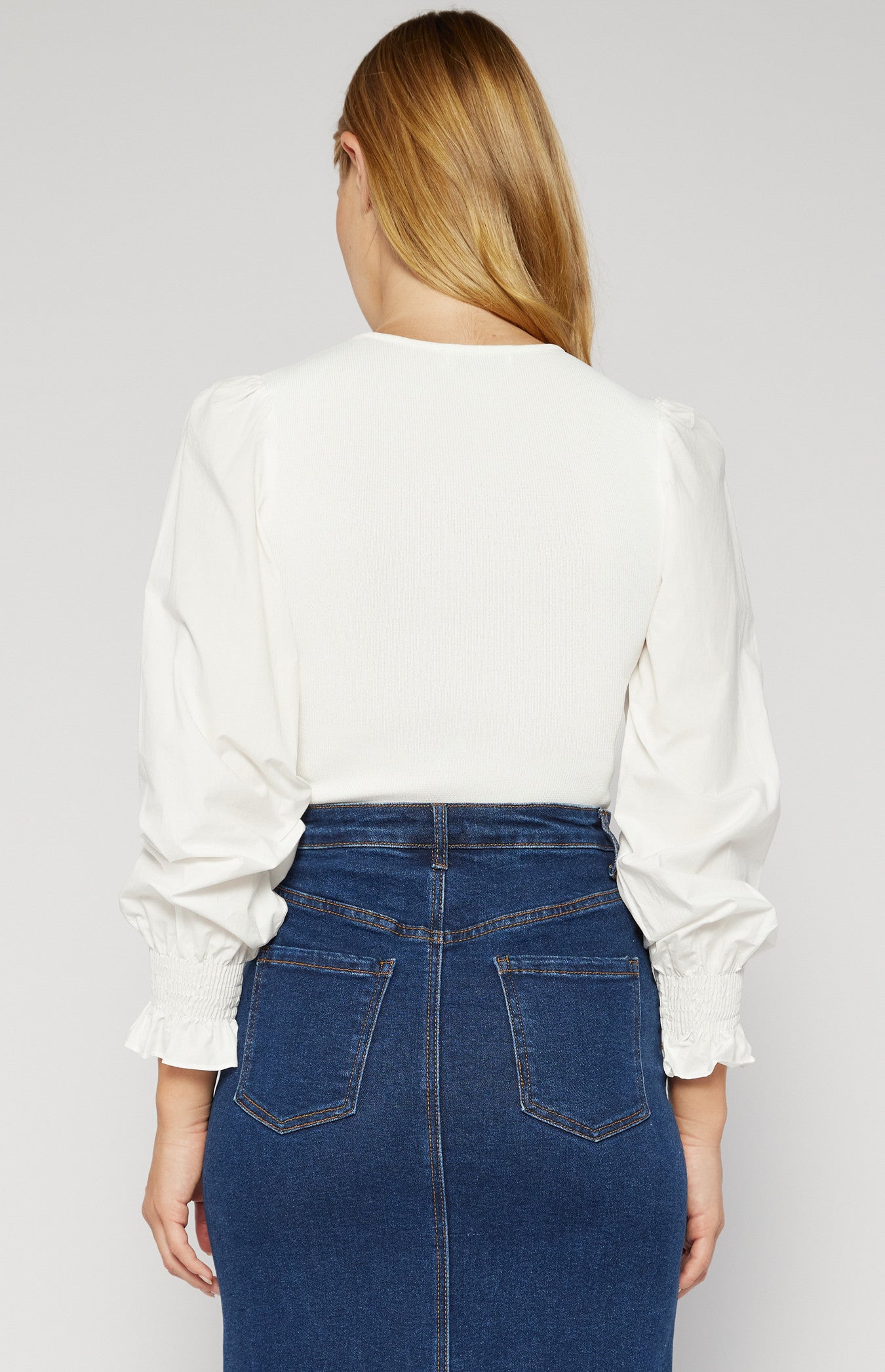 Textural contrast takes centre stage in the Knit Top with Contrast Woven Sleeves, a refined essential with a fashion-forward twist. The body is crafted from soft, stretch knit for a flattering fit, while the woven sleeves add crisp structure and subtle volume. Perfectly polished yet effortlessly wearable, it’s a standout piece for elevated daywear or modern office styling.