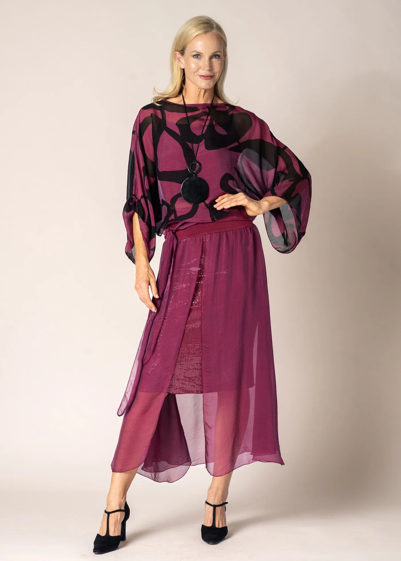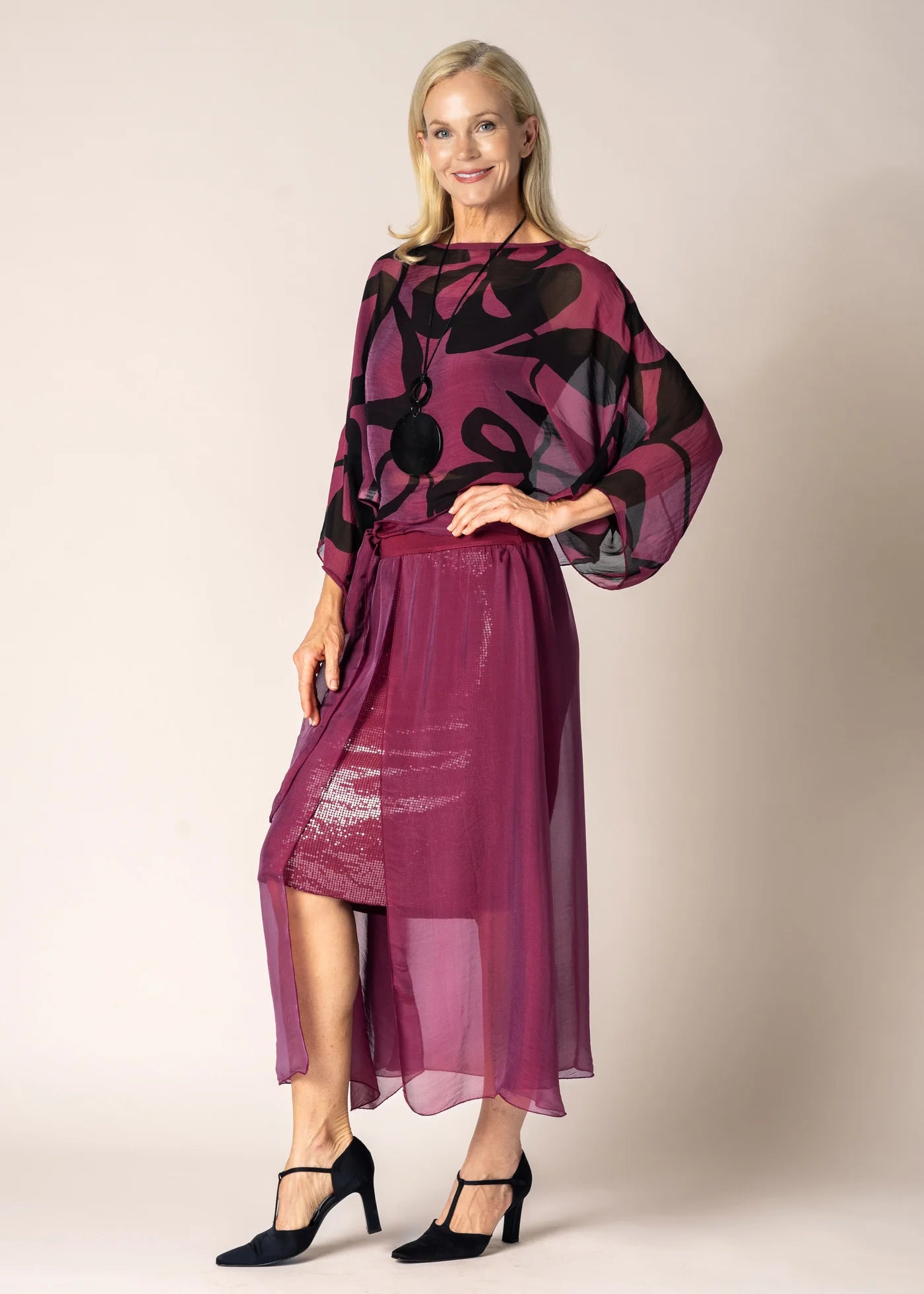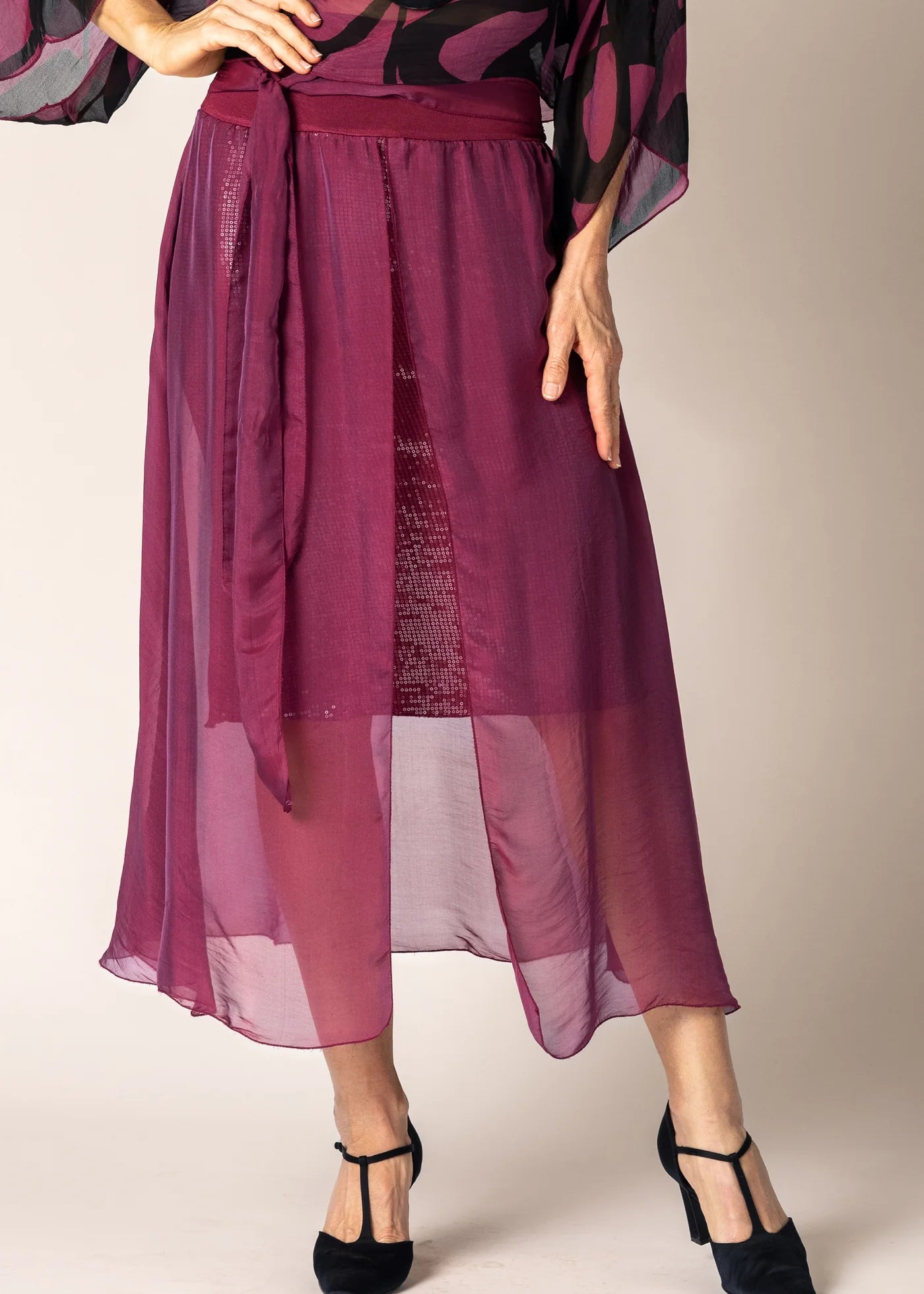 The Lidia Silk Skirt in Mulberry Wine is a sophisticated choice for those seeking an effortlessly elegant addition to their wardrobe. With its flattering silhouette and exquisite sequin embellishments, this skirt is perfect for elevating your everyday style or adding a dash of glamour to your evening ensemble.