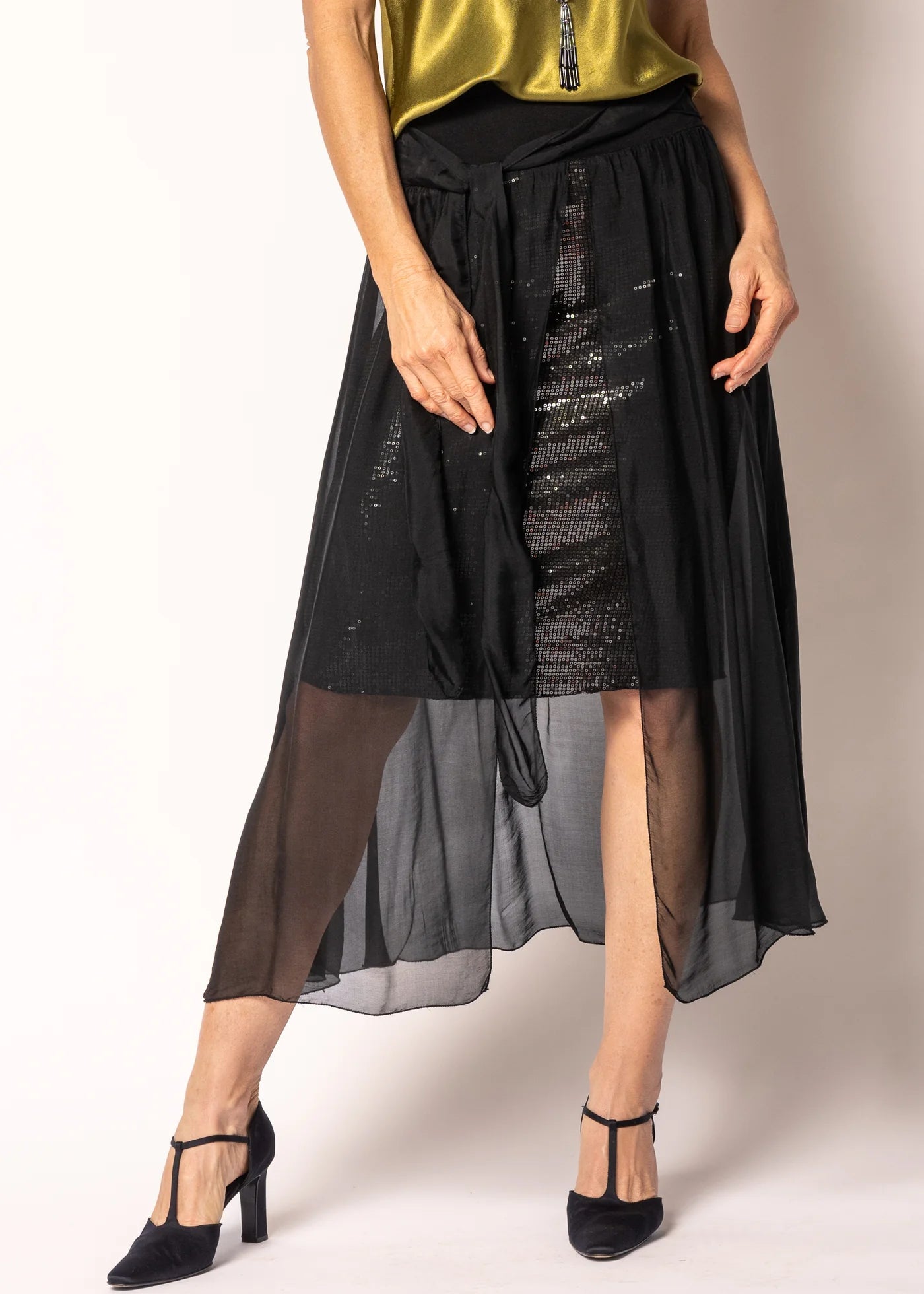The Lidia Silk Skirt in Onyx features a figure-hugging slip embellished with delicate sequin accents, lending a subtle shimmer beneath the sheer silk outer layer. A romantic silk bow elegantly ties at the front, while the soft cotton waistband is thoughtfully included for all-day comfort.