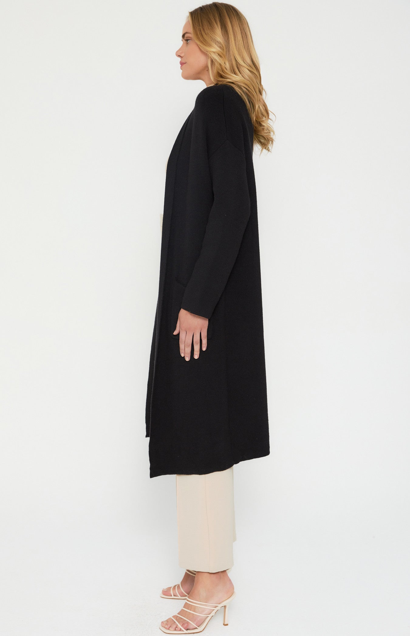 Timeless and effortlessly elegant, the Longline Cardigan with Pockets is your go-to layer for cool-weather chic. Crafted from a soft knit with a clean open front, this cardigan features a relaxed longline silhouette and functional patch pockets for a touch of practicality. In classic black, it’s the ultimate throw-on-and-go essential — equally refined over dresses, denim, or tailored sets.