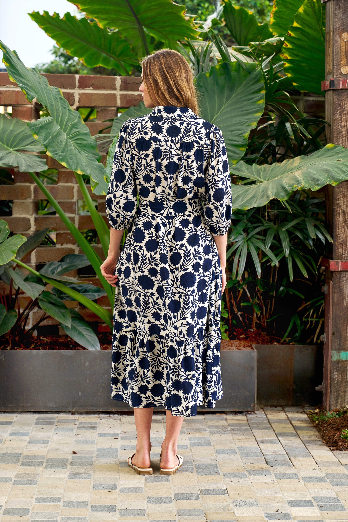 • Effortless boho midi in a deep navy hue with intricate cream print