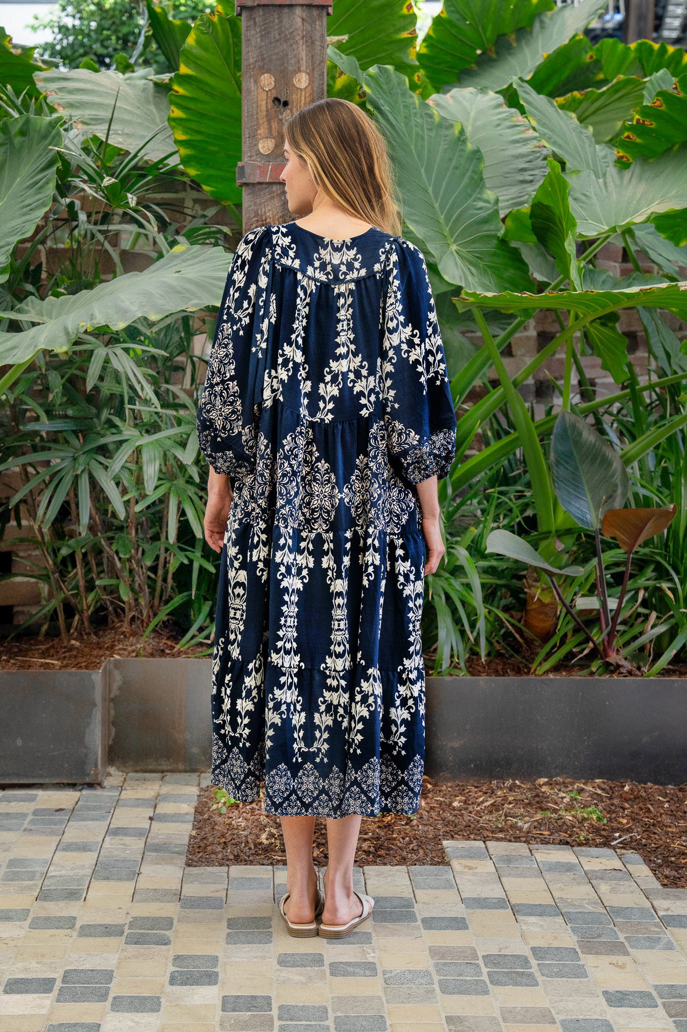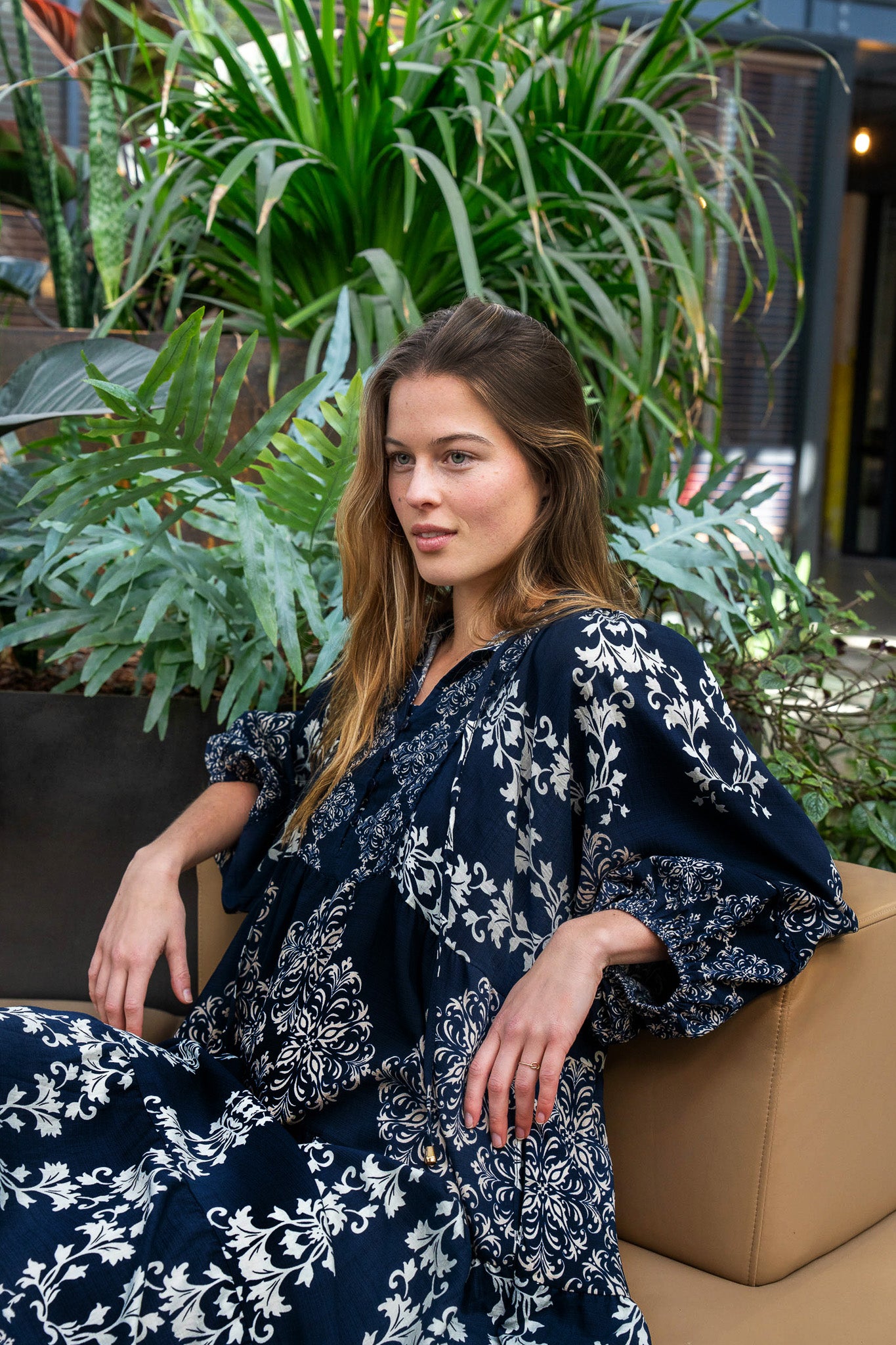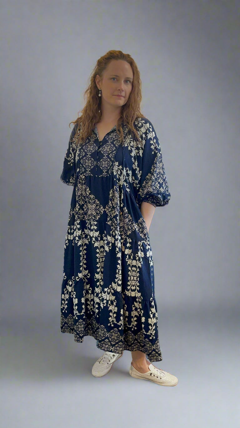 • Effortless boho midi in a deep navy hue with intricate cream print