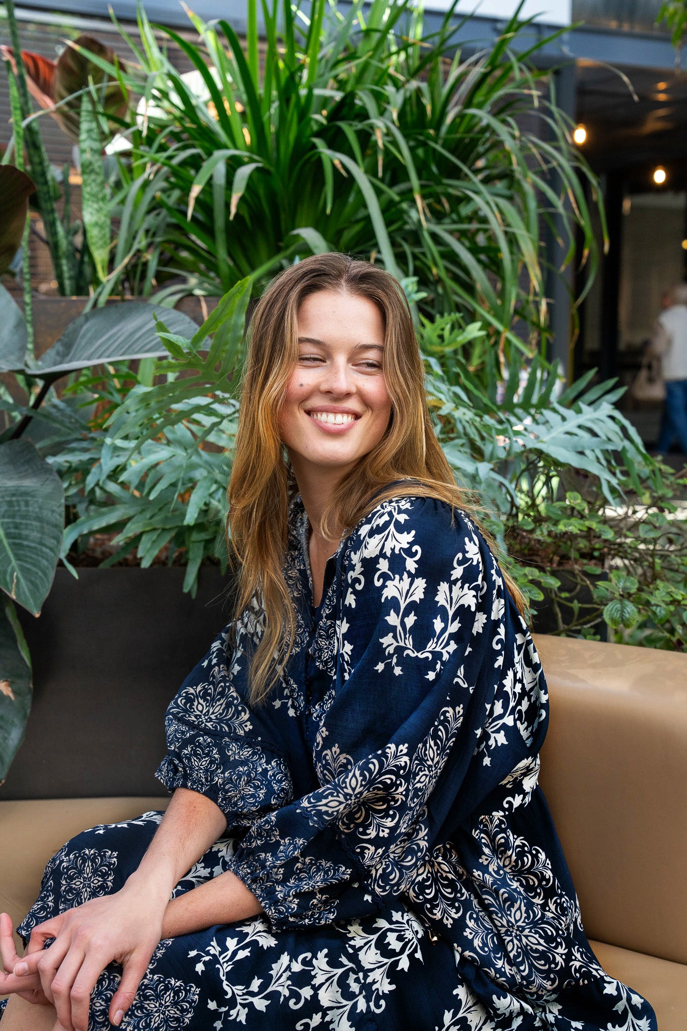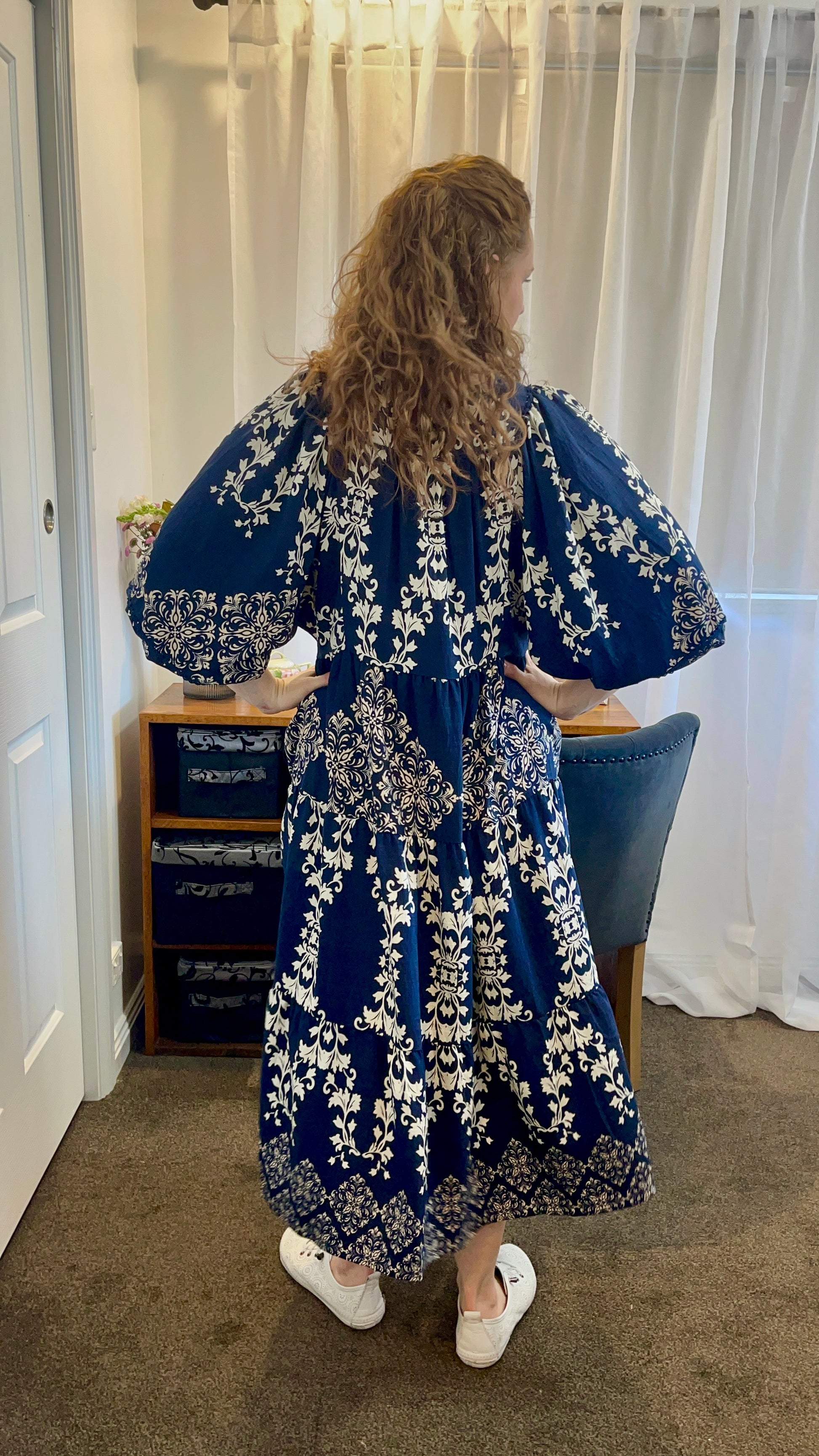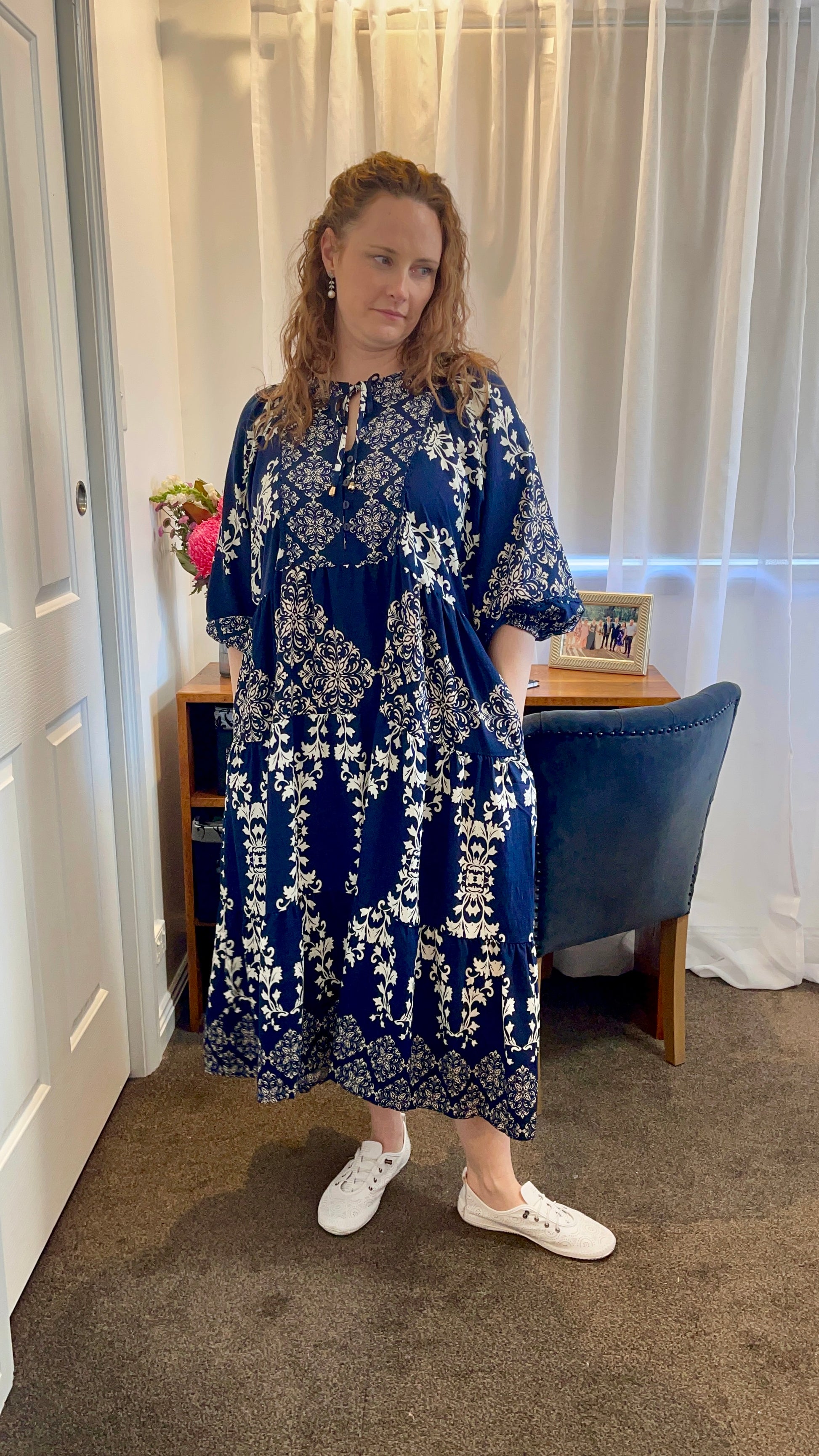 • Effortless boho midi in a deep navy hue with intricate cream print