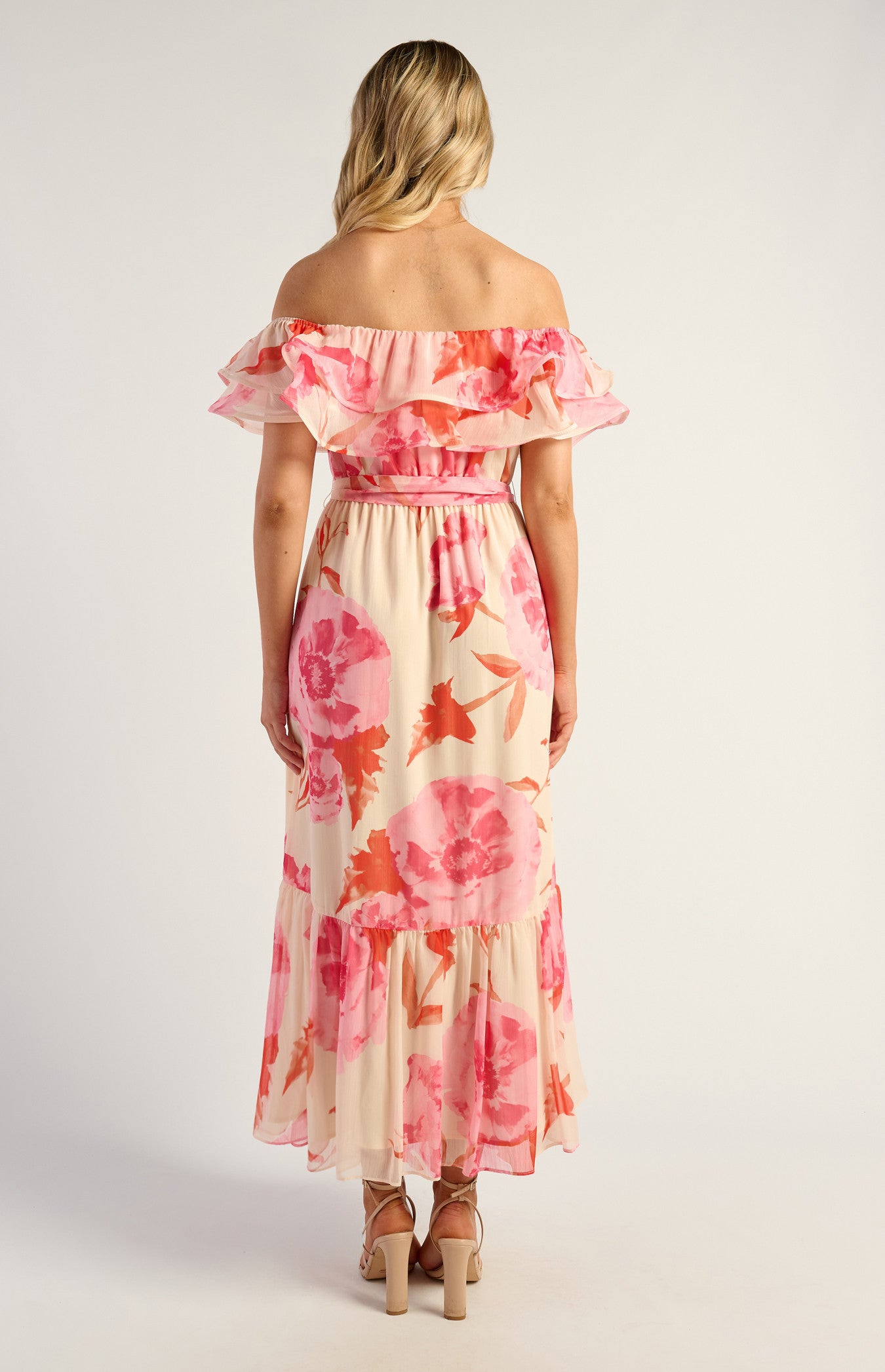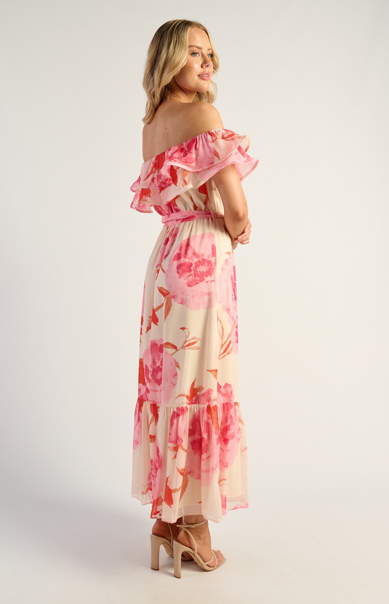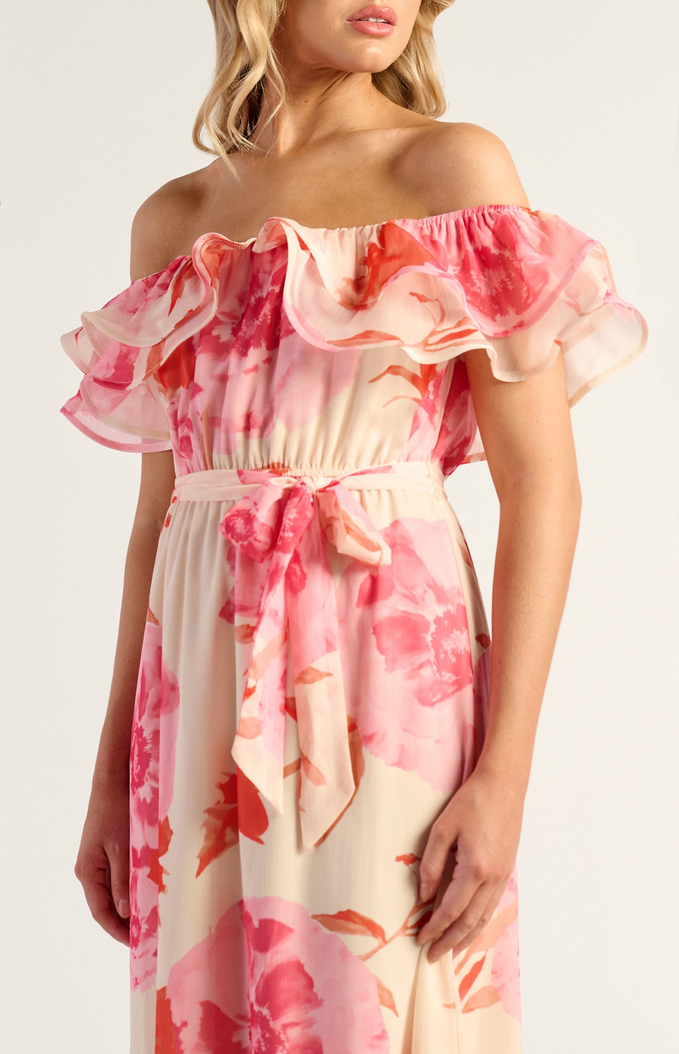 Off-Shoulder Double Frill Feature Neckline Floral Print Chiffon Dress