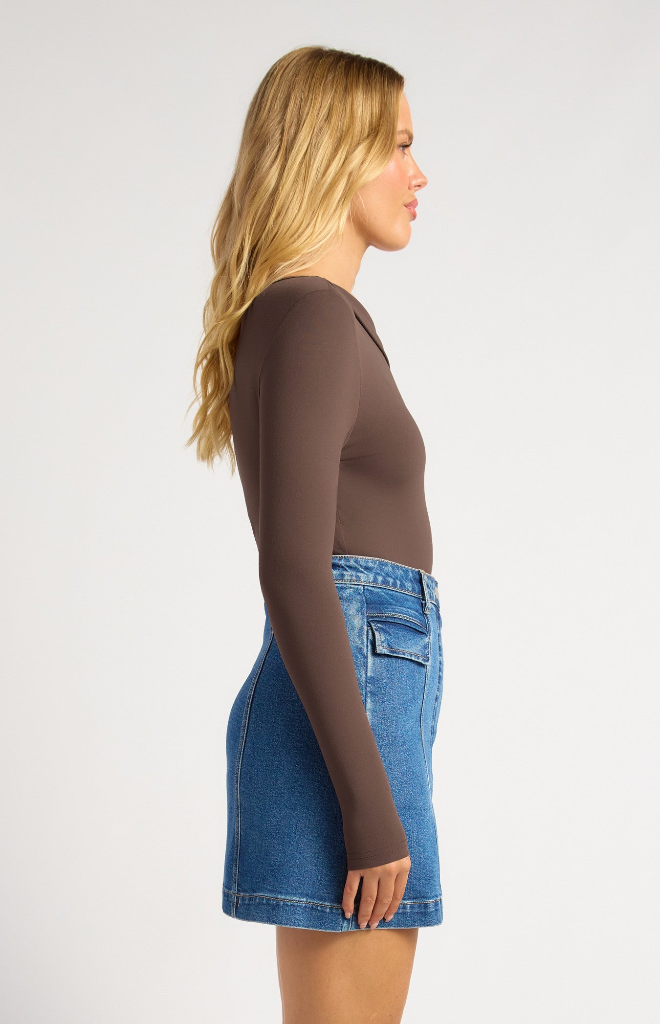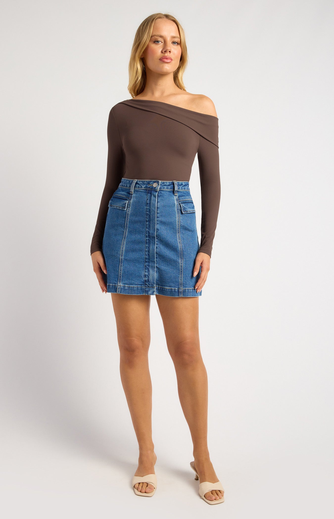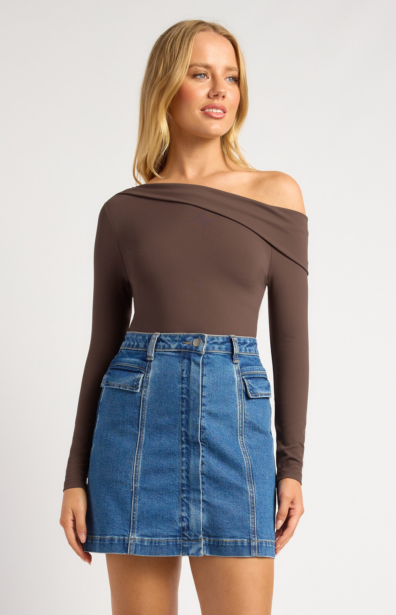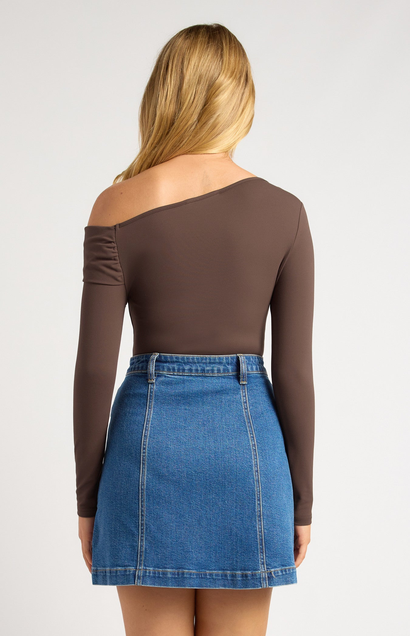 Striking in its simplicity, the One Shoulder Long Sleeve Jersey Bodysuit delivers clean lines and confident styling. Crafted from soft stretch jersey, this sleek bodysuit features an asymmetrical neckline with a single long sleeve for a modern silhouette. Designed to contour and layer effortlessly, it’s a must-have for pairing with tailored separates or elevated denim.