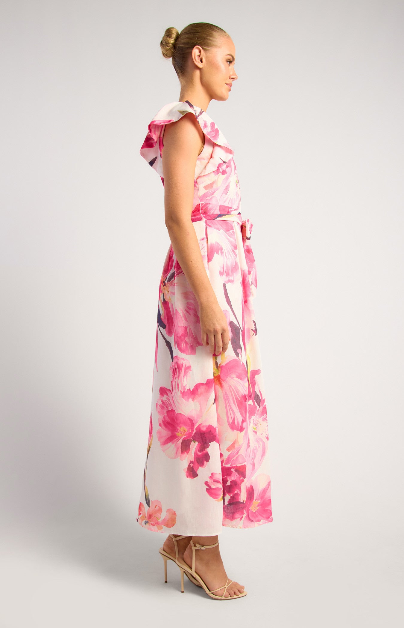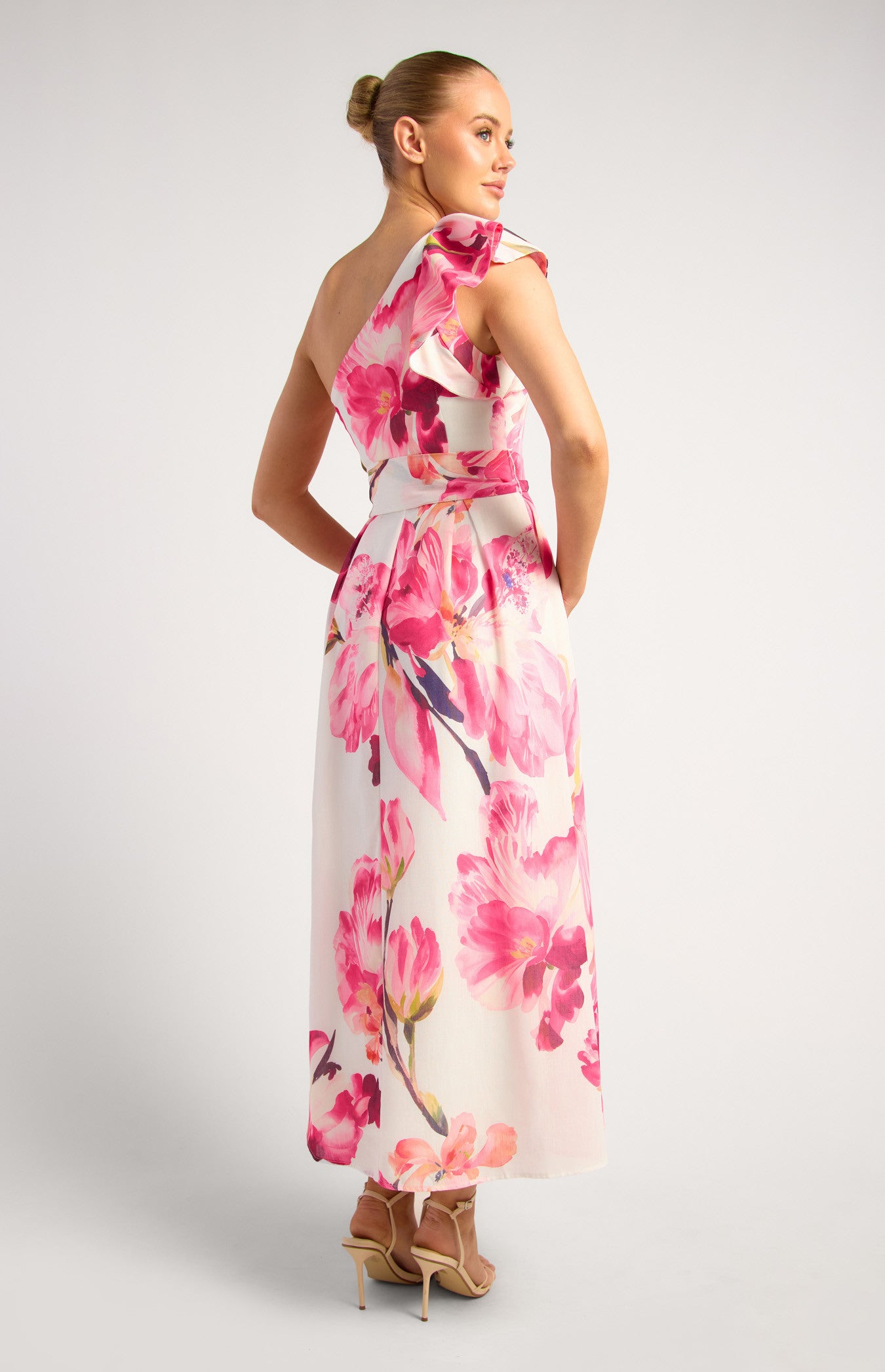 One Shoulder Ruffle Sleeve Floral Midi Dress
