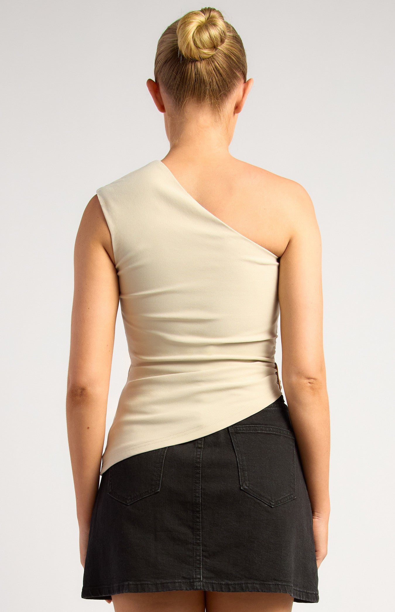 One Shoulder Stretch Rayon Blend Jersey Top With Side Gold Buckle