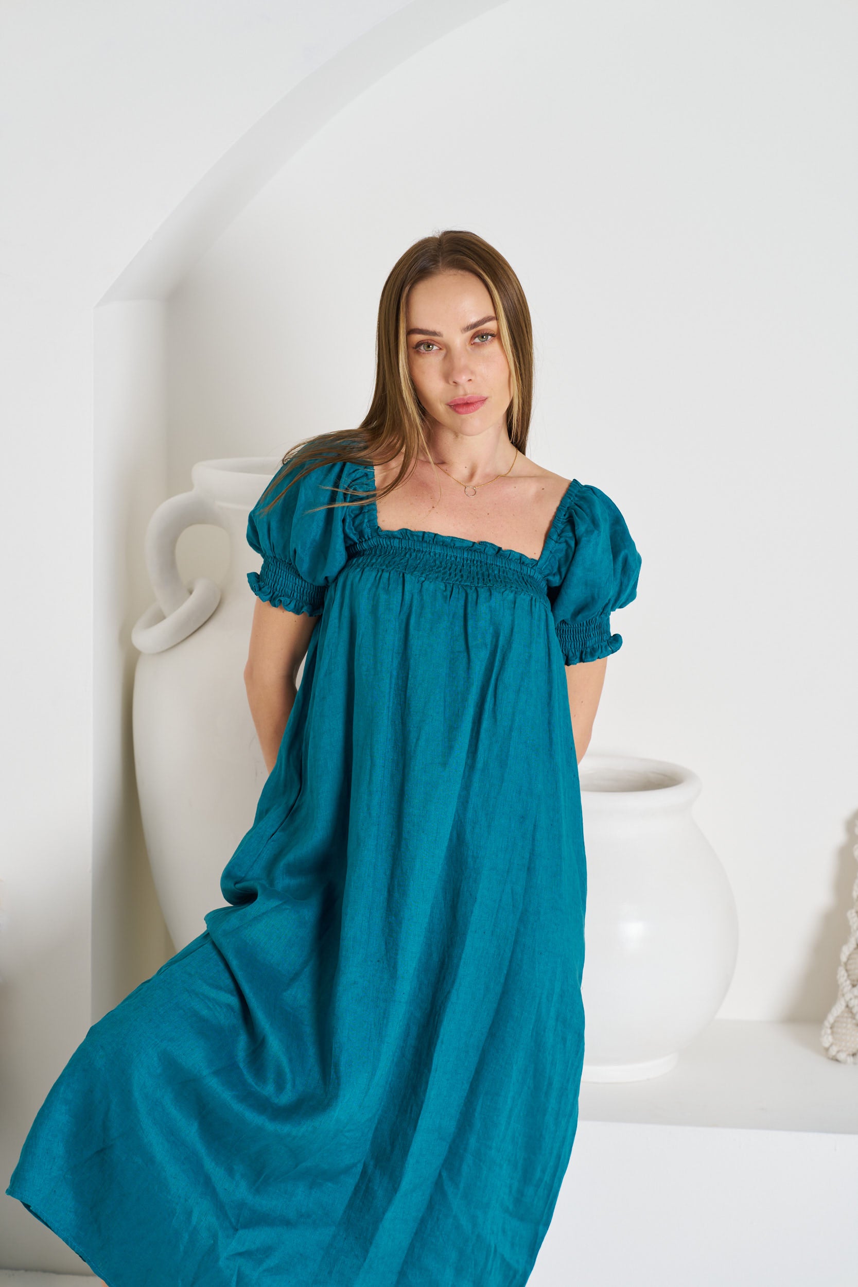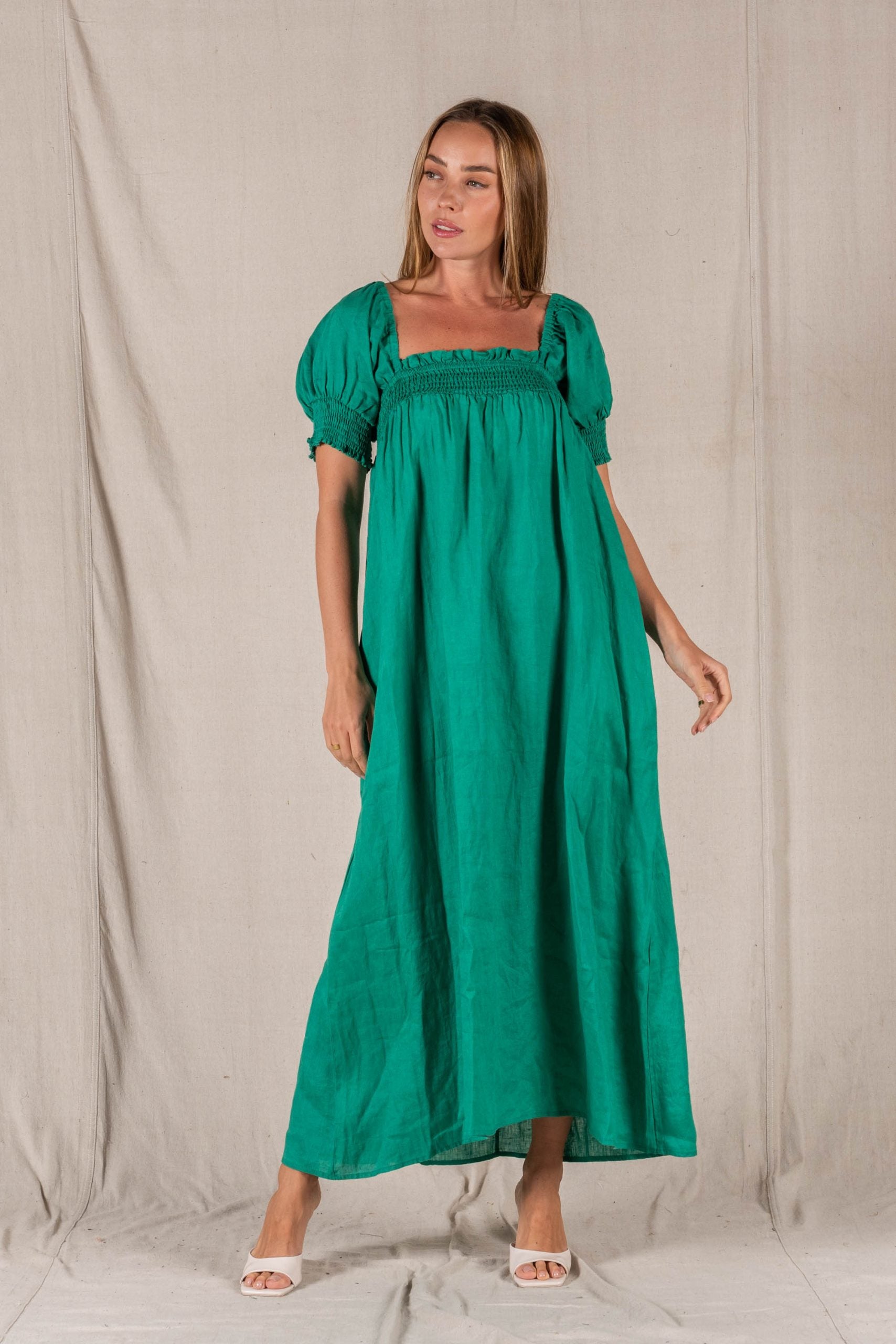 Effortless, romantic and naturally breathable — the PIA Dress is your go-to for elevated everyday styling. Crafted from 100% premium linen, this maxi dress features a beautifully shirred neckline that sits softly across the shoulders, complemented by an elasticated puff sleeve for a feminine touch. The flowing silhouette drapes gracefully while functional side pockets add everyday practicality.