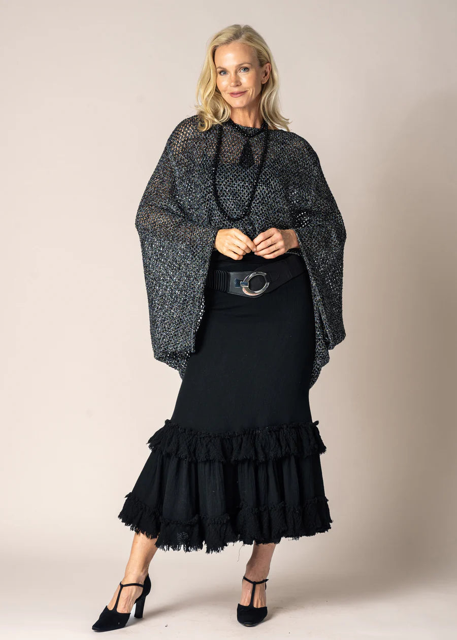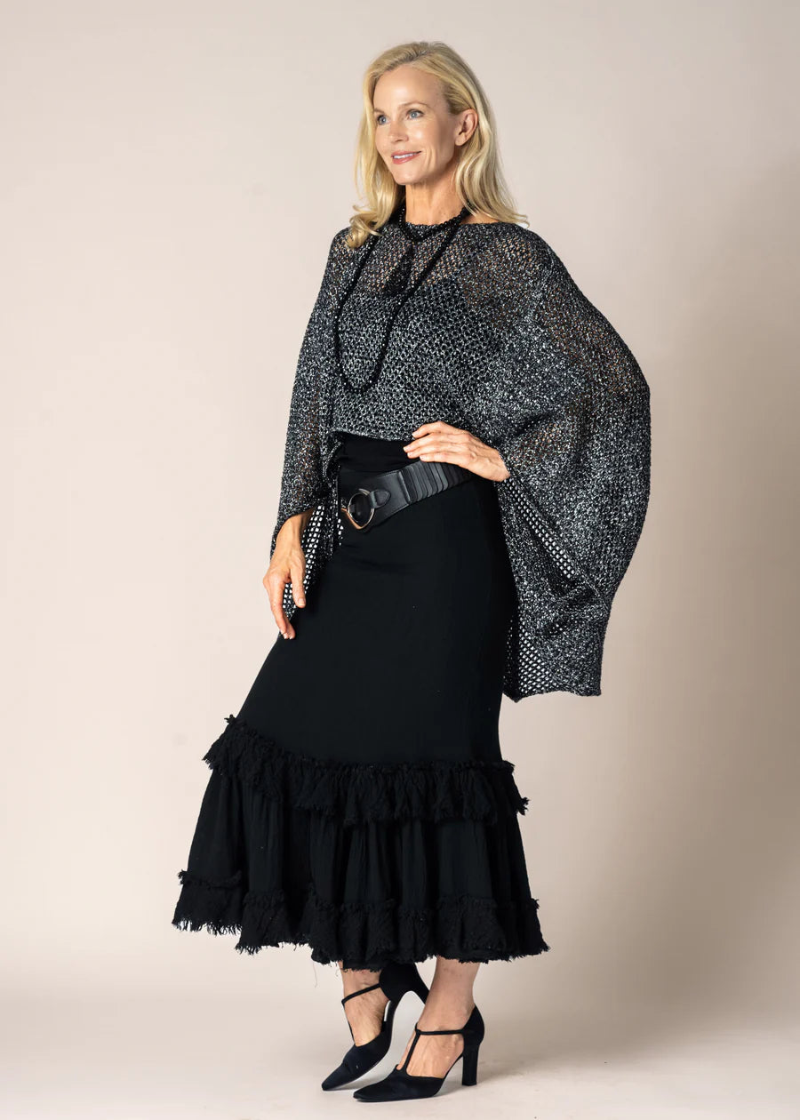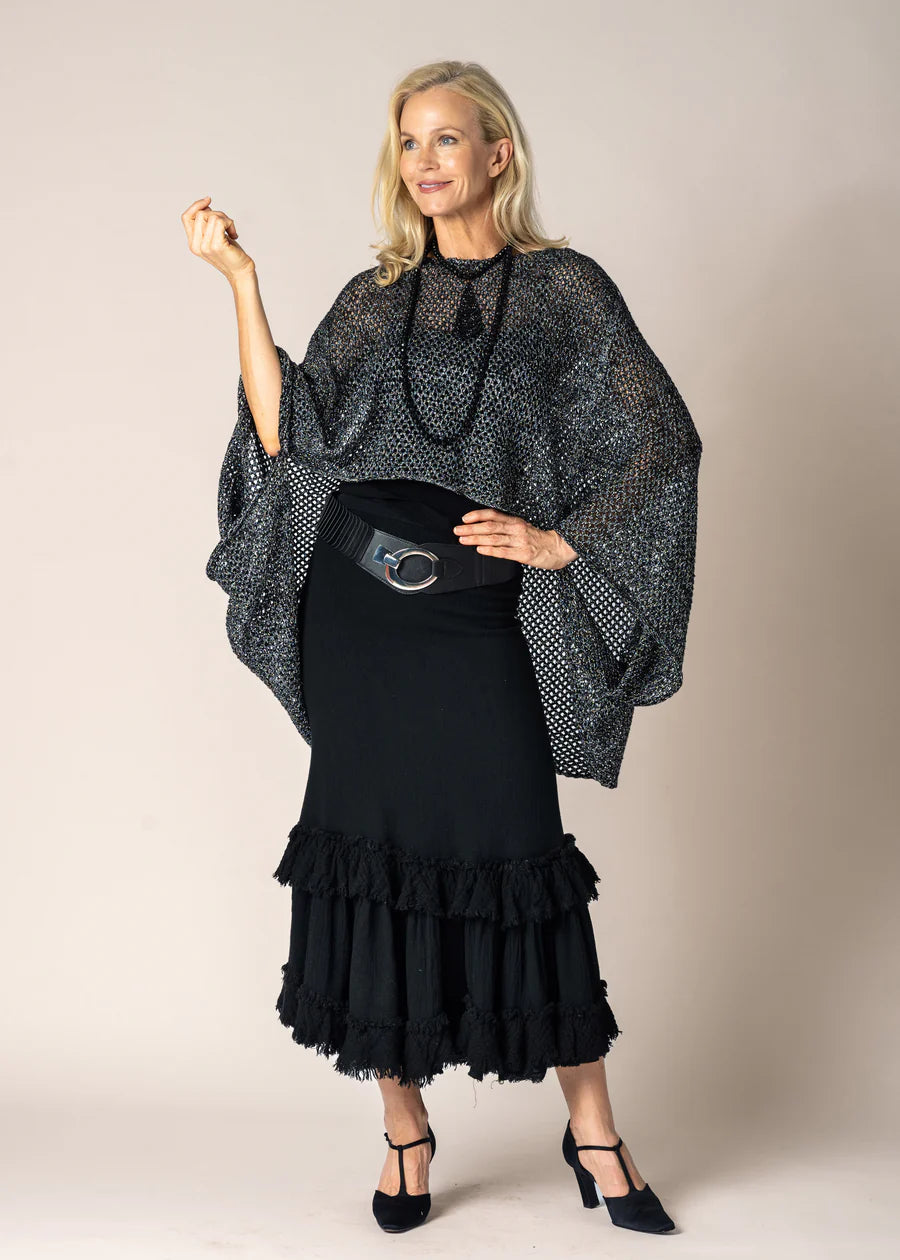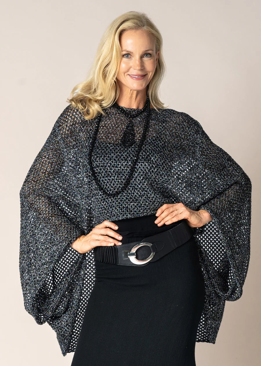 Physically, this knit top is designed with a flattering high-low hem that shapes the silhouette gracefully. Its poncho style offers a relaxed yet refined fit, combining comfort with effortless style. The silver tone, enriched by the metallic threads, ensures it catches the light beautifully throughout the day.