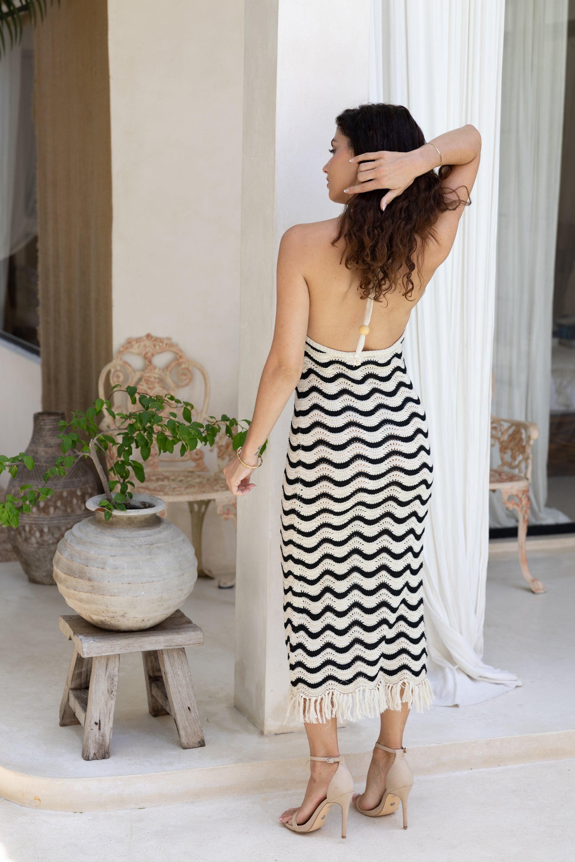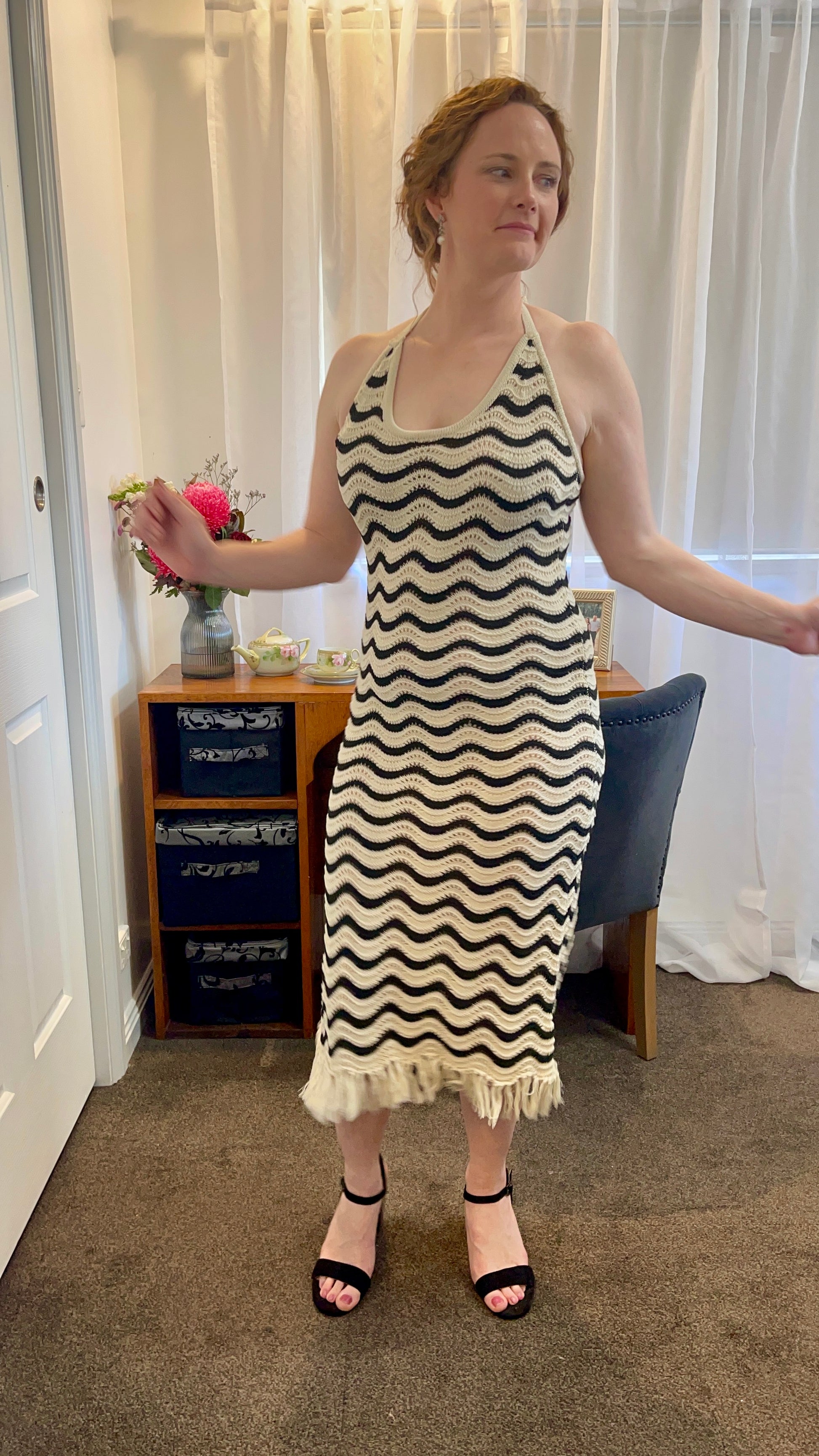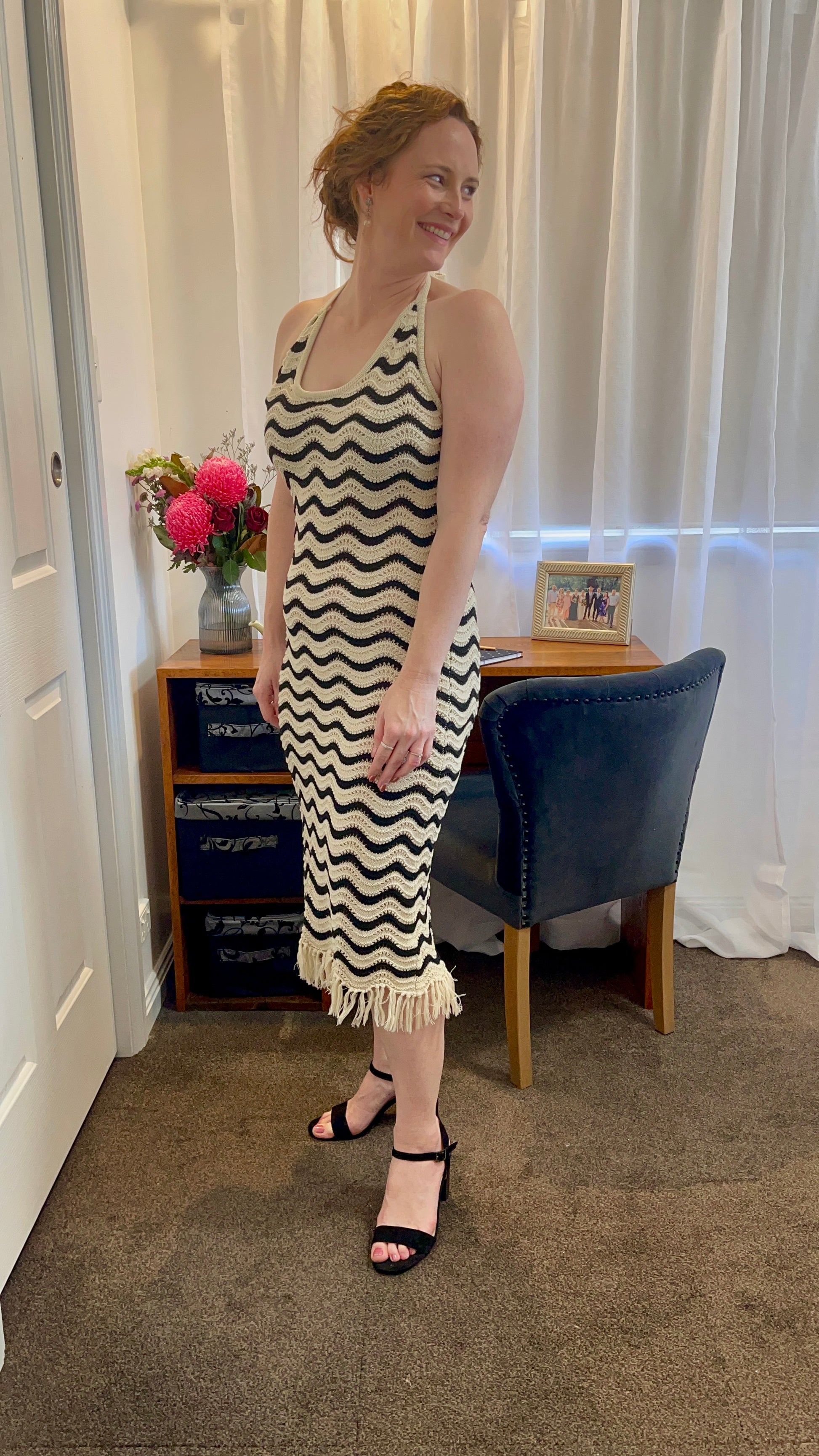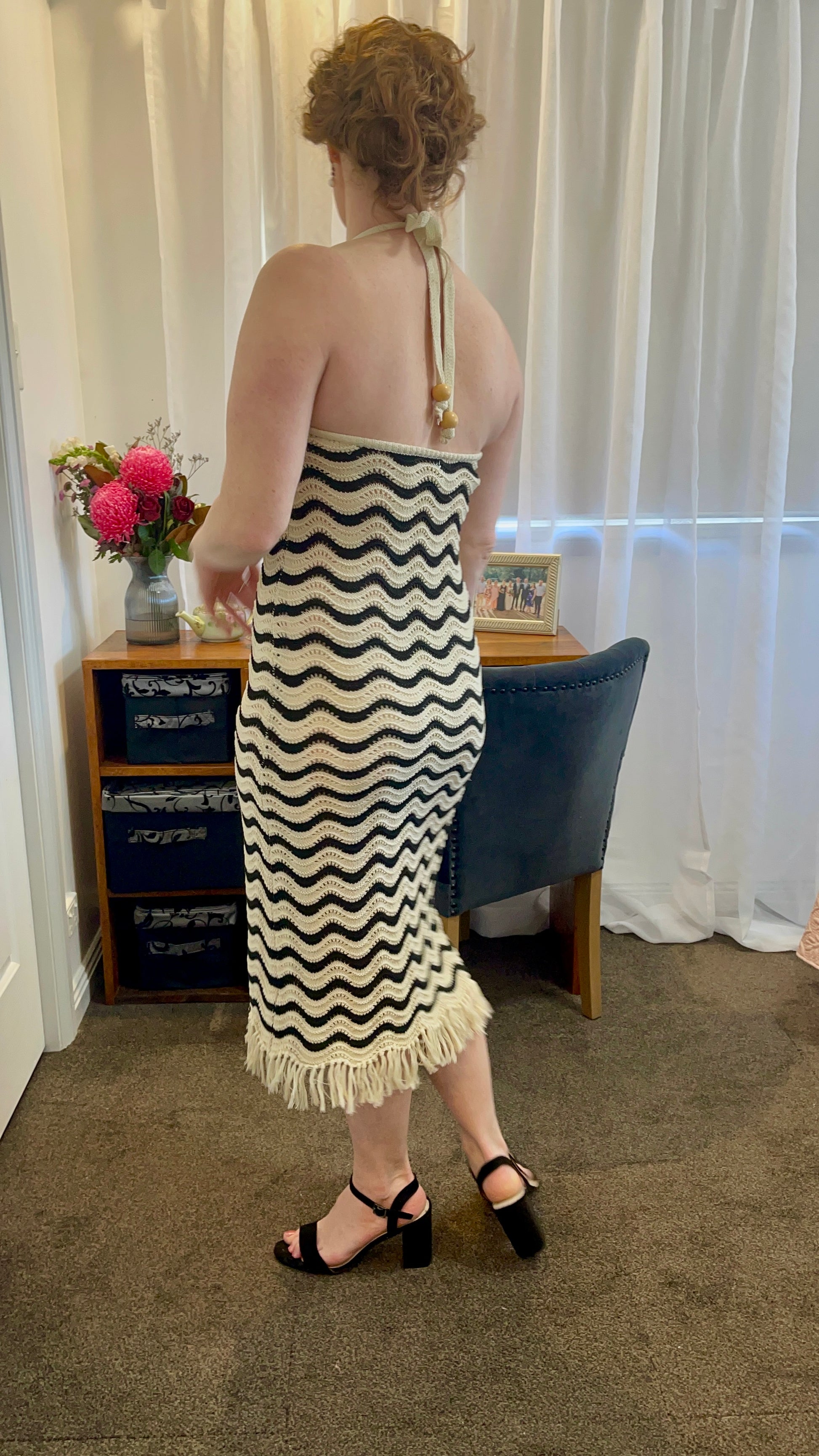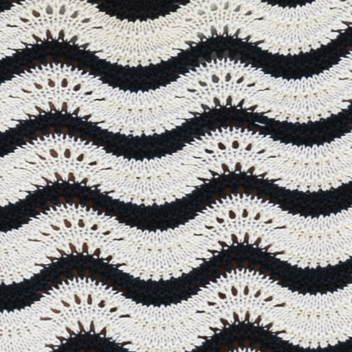 • Handcrafted crochet-style knit with bold black and cream Chevron design