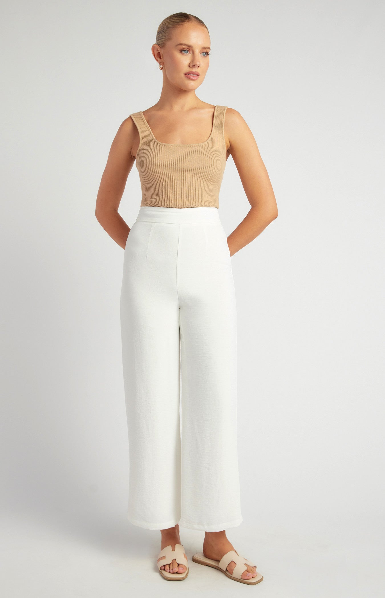 - High-waisted fit with subtle pleating