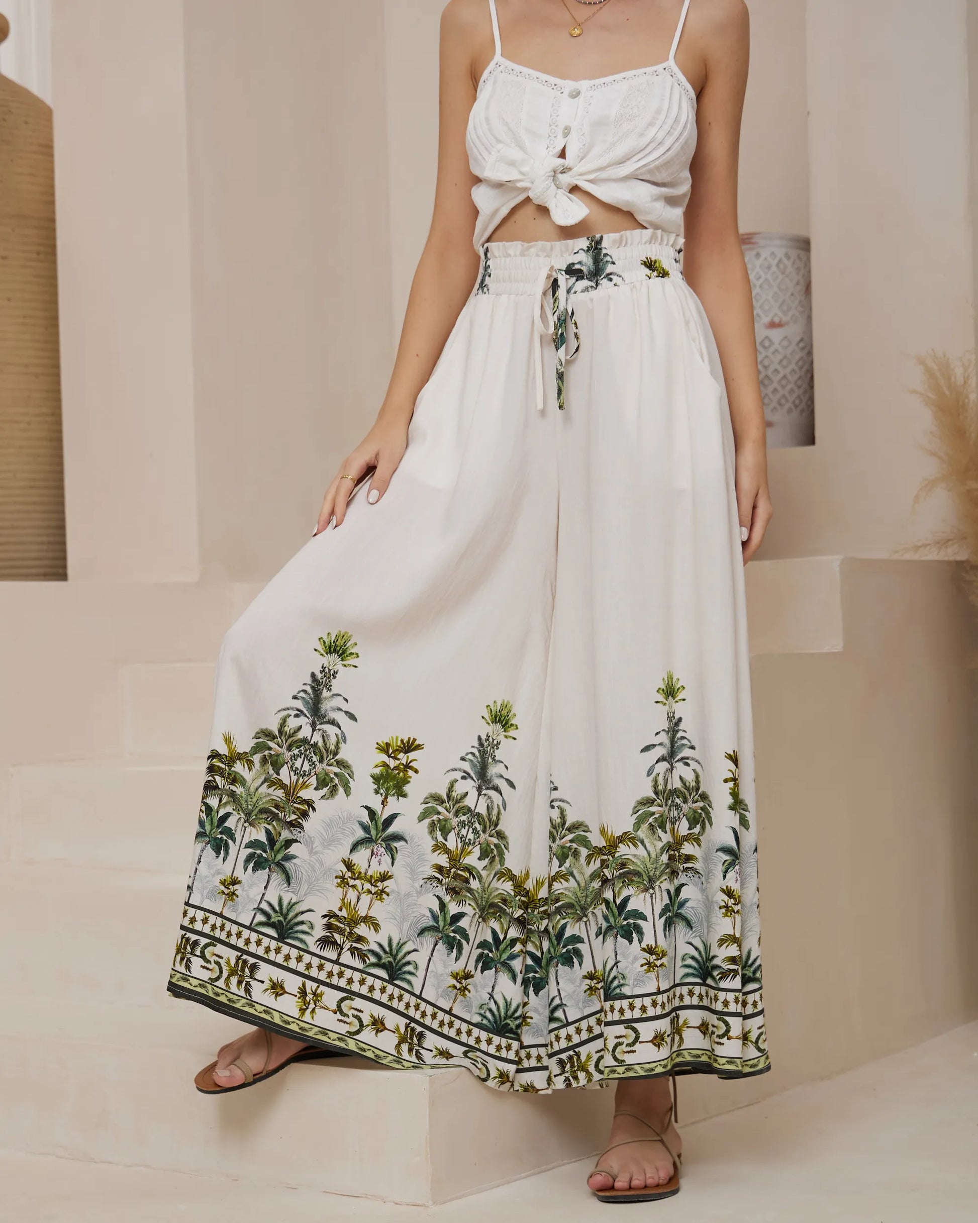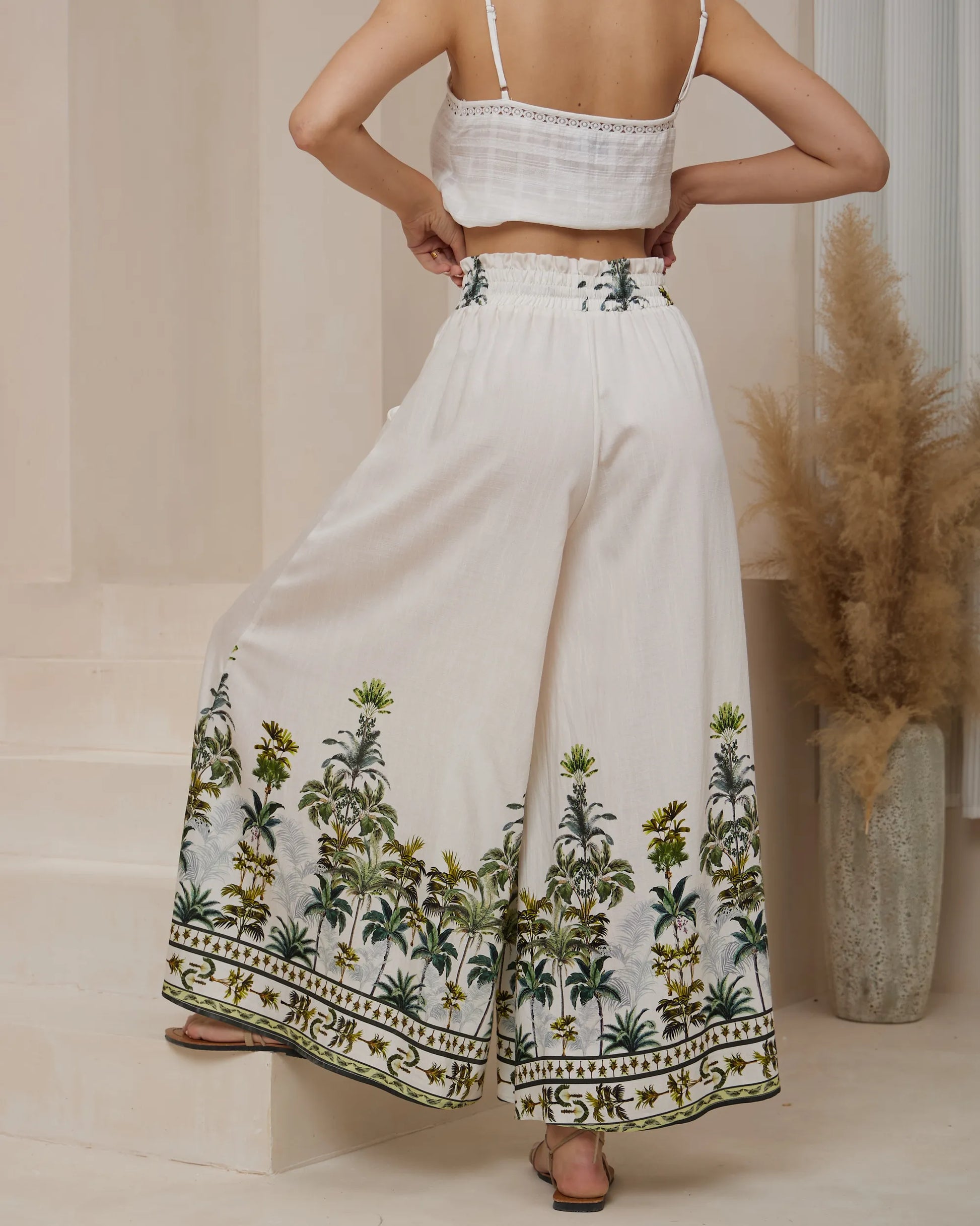 • Relaxed wide-leg pants in the off-white and tropical green palm print
